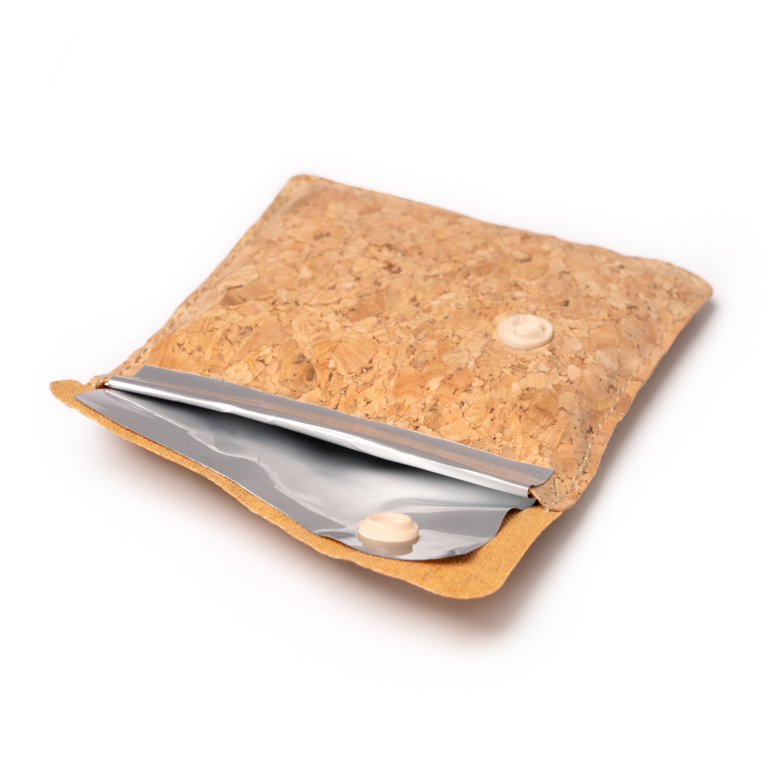Cenicero de corcho e interior de aluminio ignífugo. Cierre de seguridad con botón.