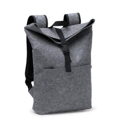 Mochila realizada en 600D RPET con acabado jaspeado. Gran compartimento interior con bolsillo para portátil de 15″. Bolsillo exterior con