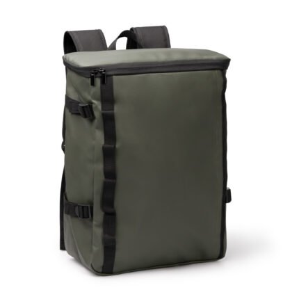 Mochila elaborada en PU y RPET 210D con compartimento principal extensible con cierre de cremallera y hebilla. En su interior