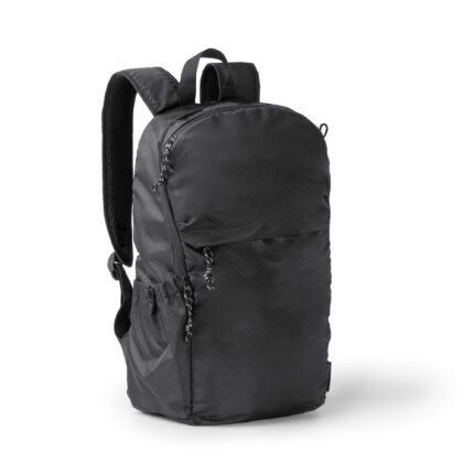 Mochila realizada en 300D RPET. Con un bolsillo principal y frontal con cierre de cremallera. Asas acolchadas y bolsillos laterales