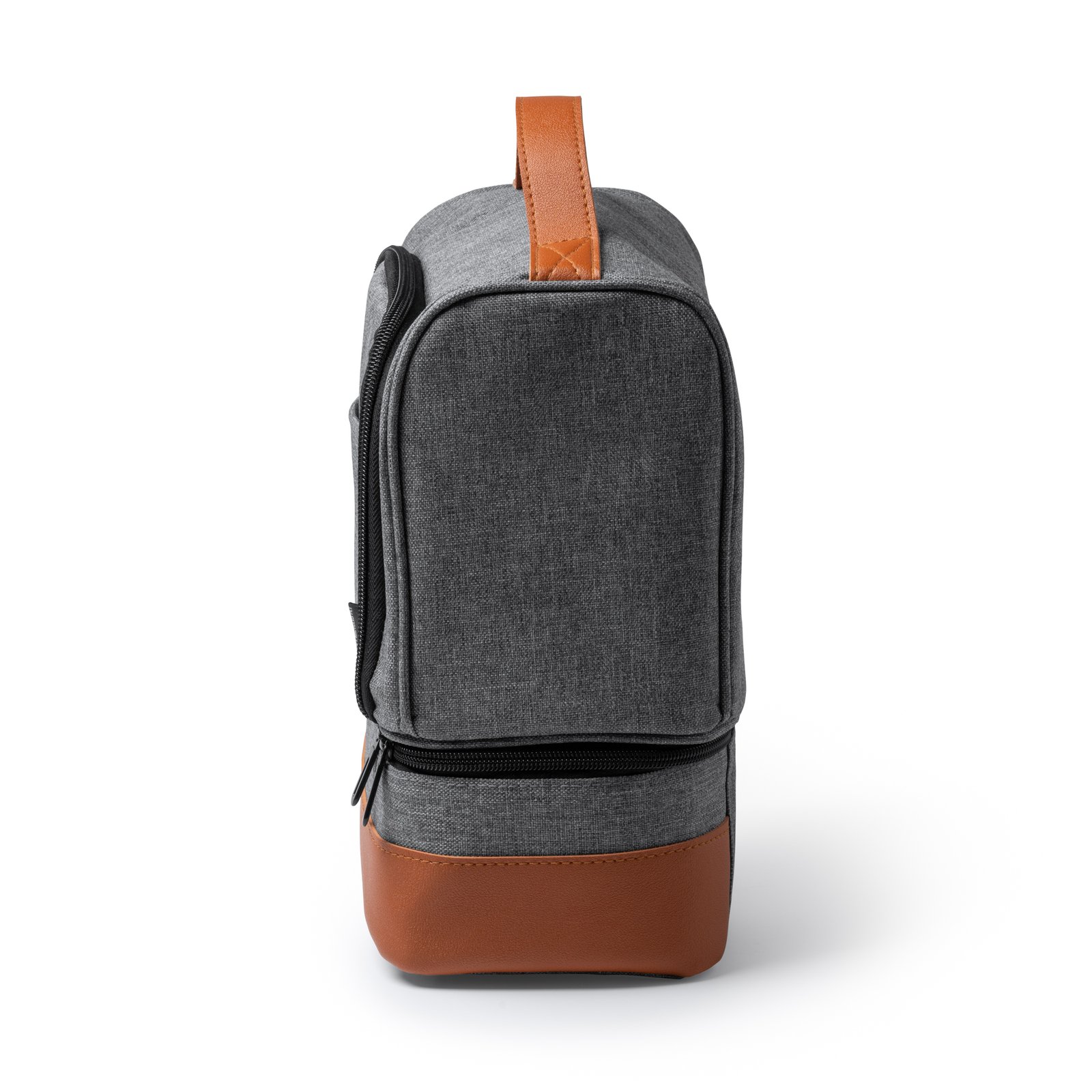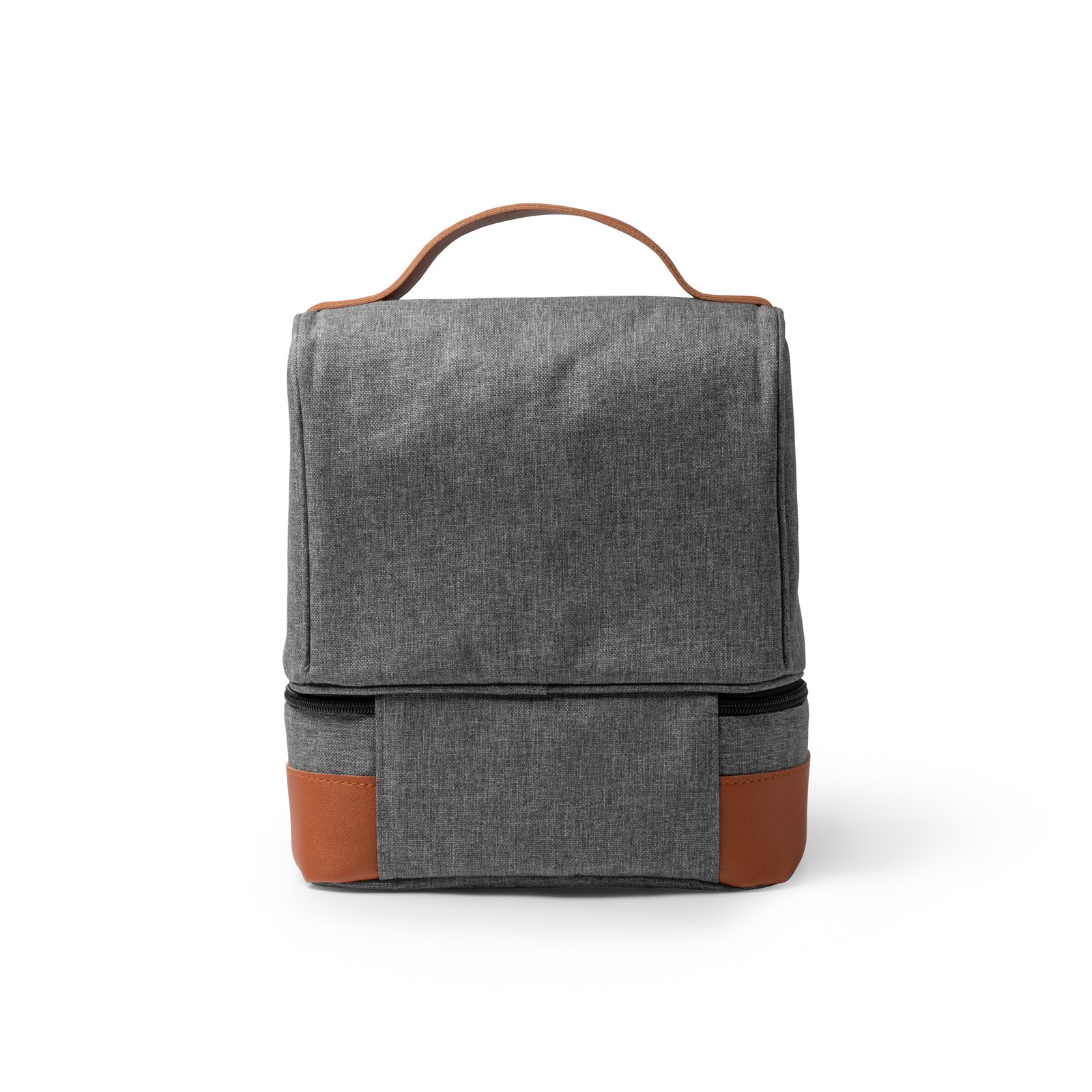 Nevera de políester reciclado RPET con diseño vigoré. Doble compartimento independientes con cierre de cremalleras y con interior isotérmico. Asas de transporte y base en PU Leather.