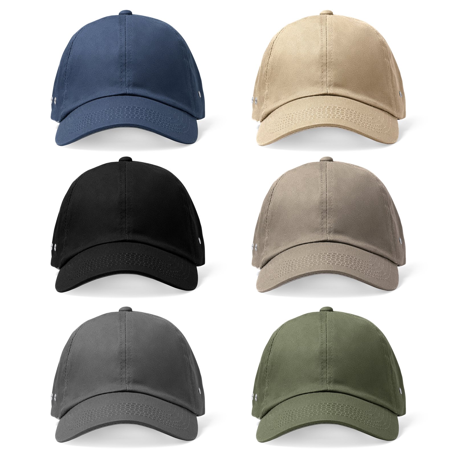 Gorra de estilo casual de 6 paneles. Parte interior de la visera y cinta antisudoral a contraste. Dos ojales metálicos en cada lateral. Cierre ajustable metálico en la parte trasera.