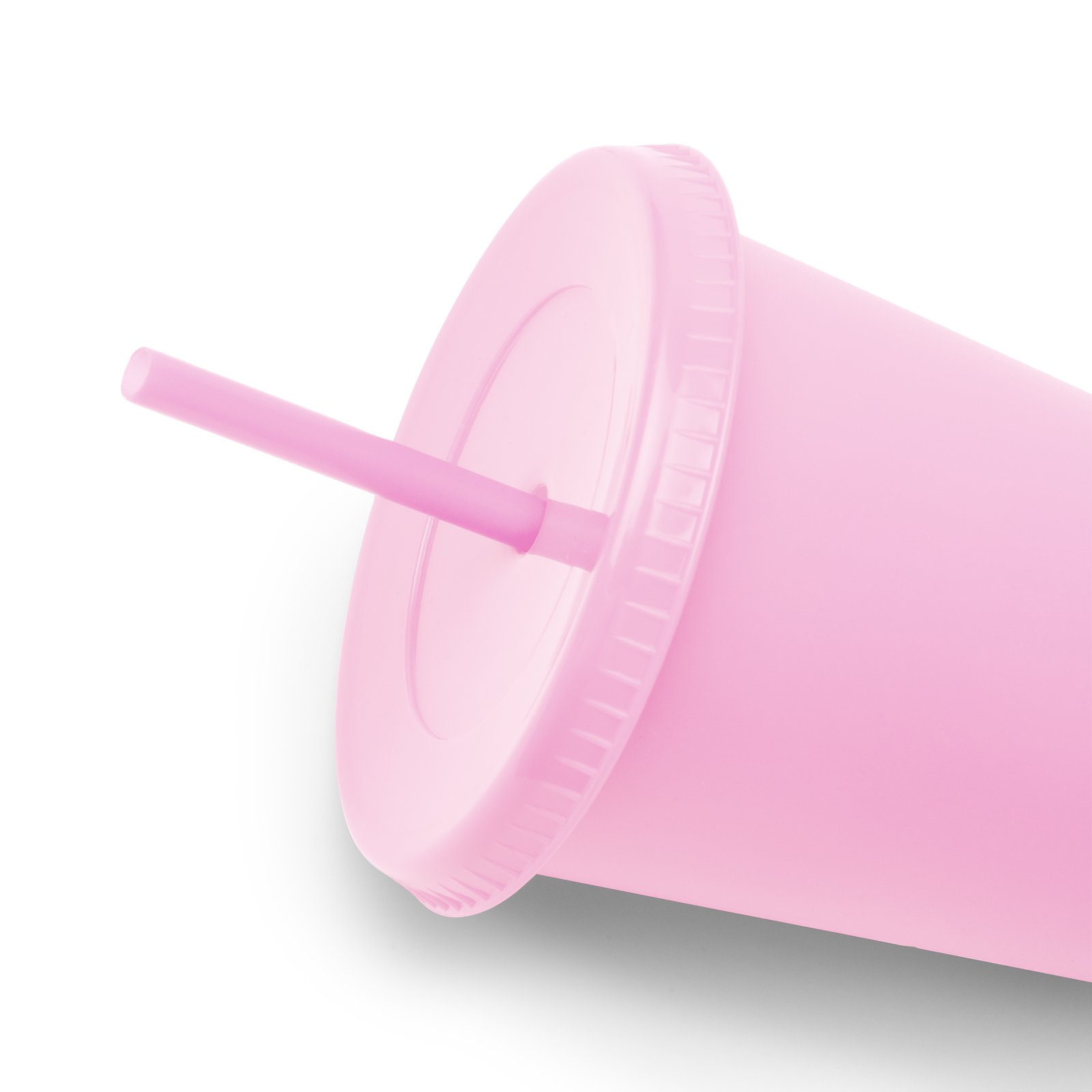 Vaso reutilizable con tapa y pajita elaborado en PP reciclado. Con capacidad de hasta 710ml. La tapa se inserta a presión y cuenta con un orificio para la pajita, resistente y rígida con un tope en su extremo que evita que se salga del vaso. Tapa y pajita van a juego del color del cuerpo del vaso. Se sirve en pack de 10.
