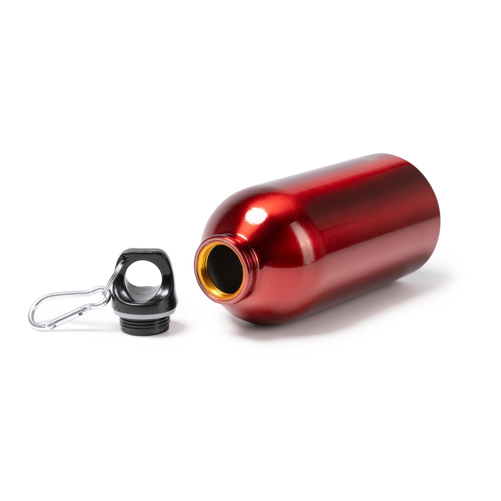 Bidón de aluminio con mosquetón. Tapón en color negro y mosquetón del mismo color metálico que la botella. Capacidad 330