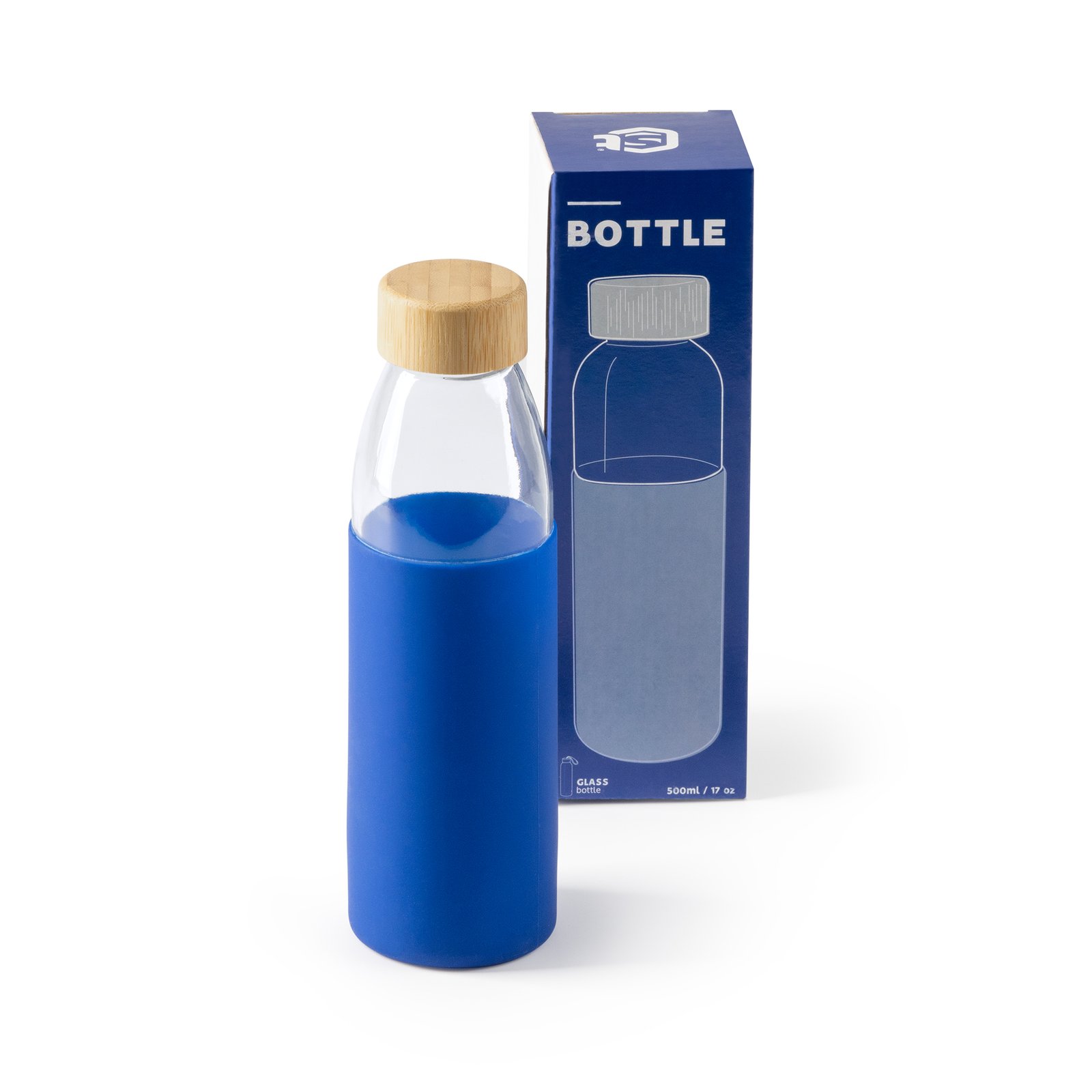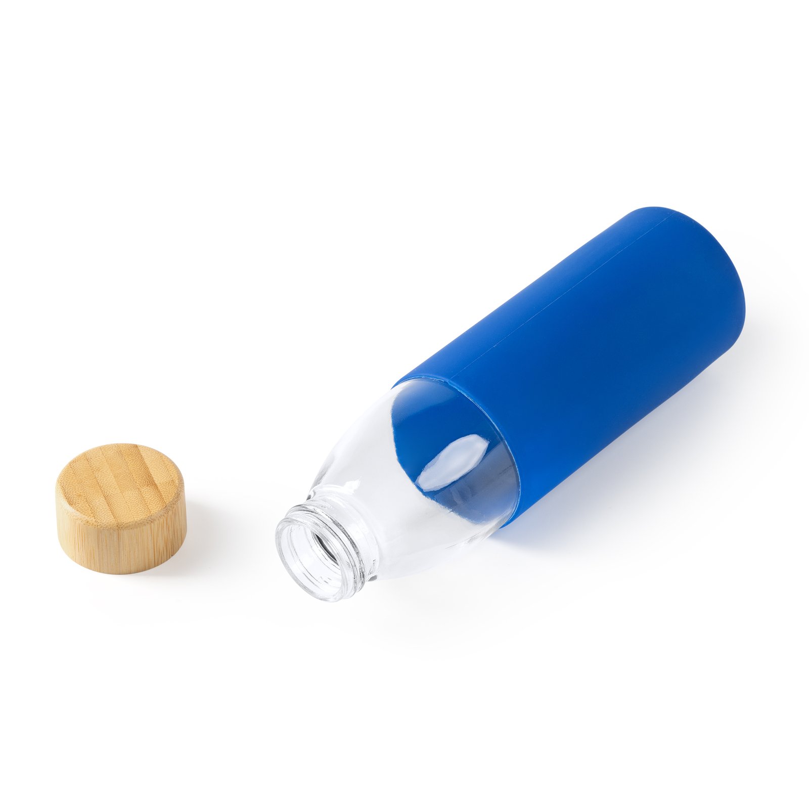 Bidón de cristal con tapón de bambú y funda de silicona en cinco colores diferentes. Capacidad de 540 ml. Perfecto para sorprender a tus clientes y promocionar tu negocio.