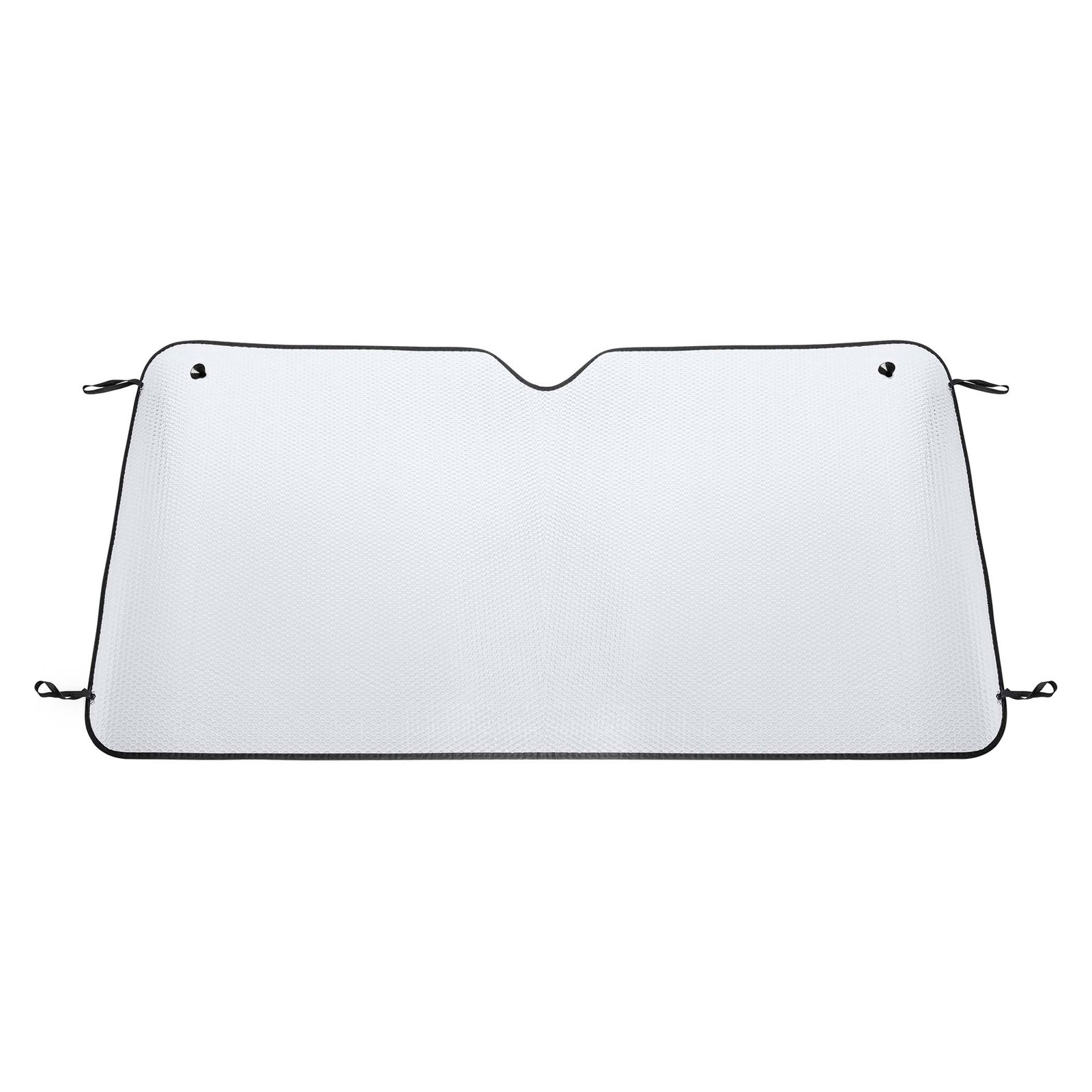 Parasol de grandes dimensiones ideal para camiones y furgonetas. Burbuja a doble cara, realizado en aluminio acabado metalizado y ribete en negro. Incluye argollas metálicas con ventosas y cintas elásticas para plegado.