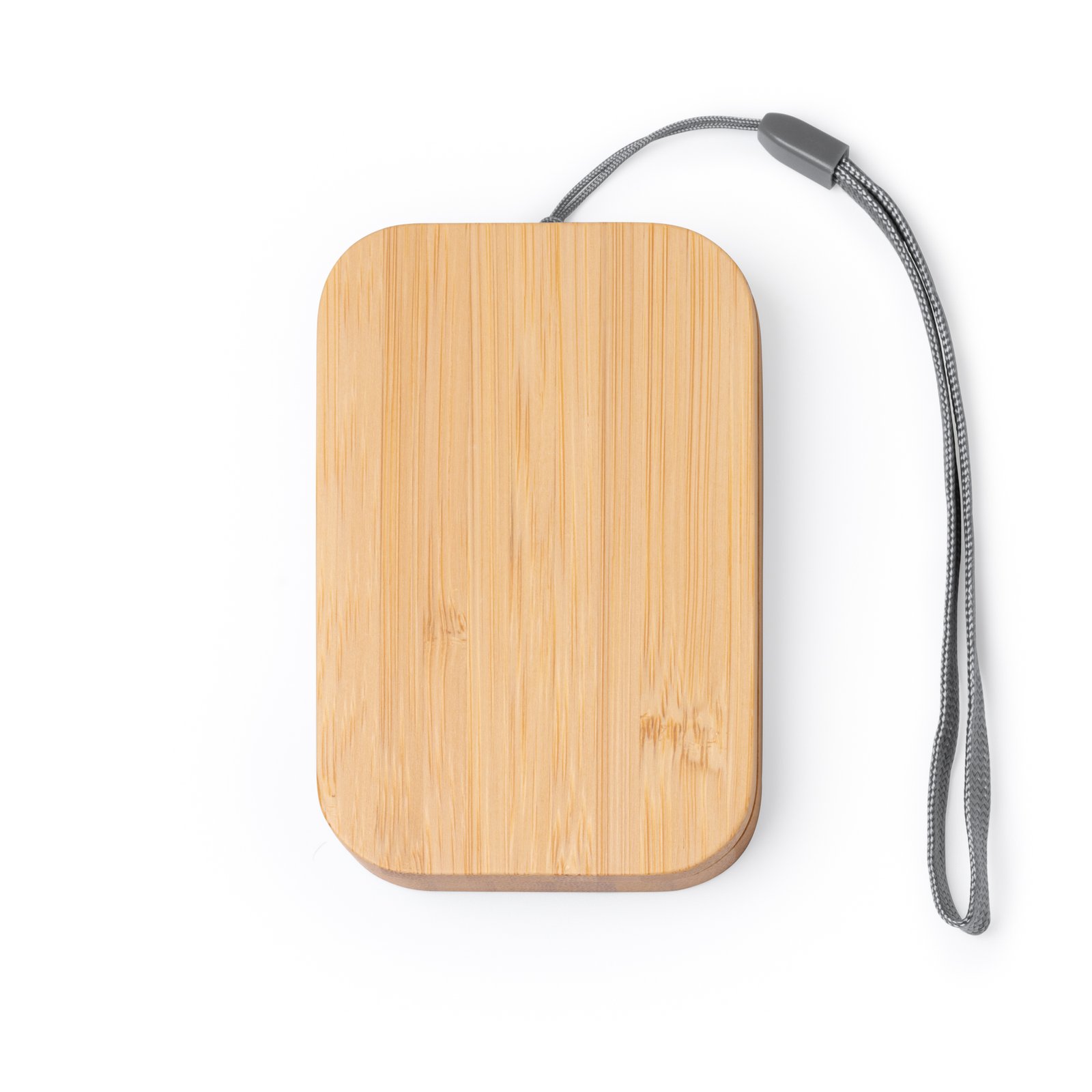 Batería externa con cuerpo de bambú y de fibra de trigo. Capacidad de 2200 mAh. Con indicador de carga luminoso.