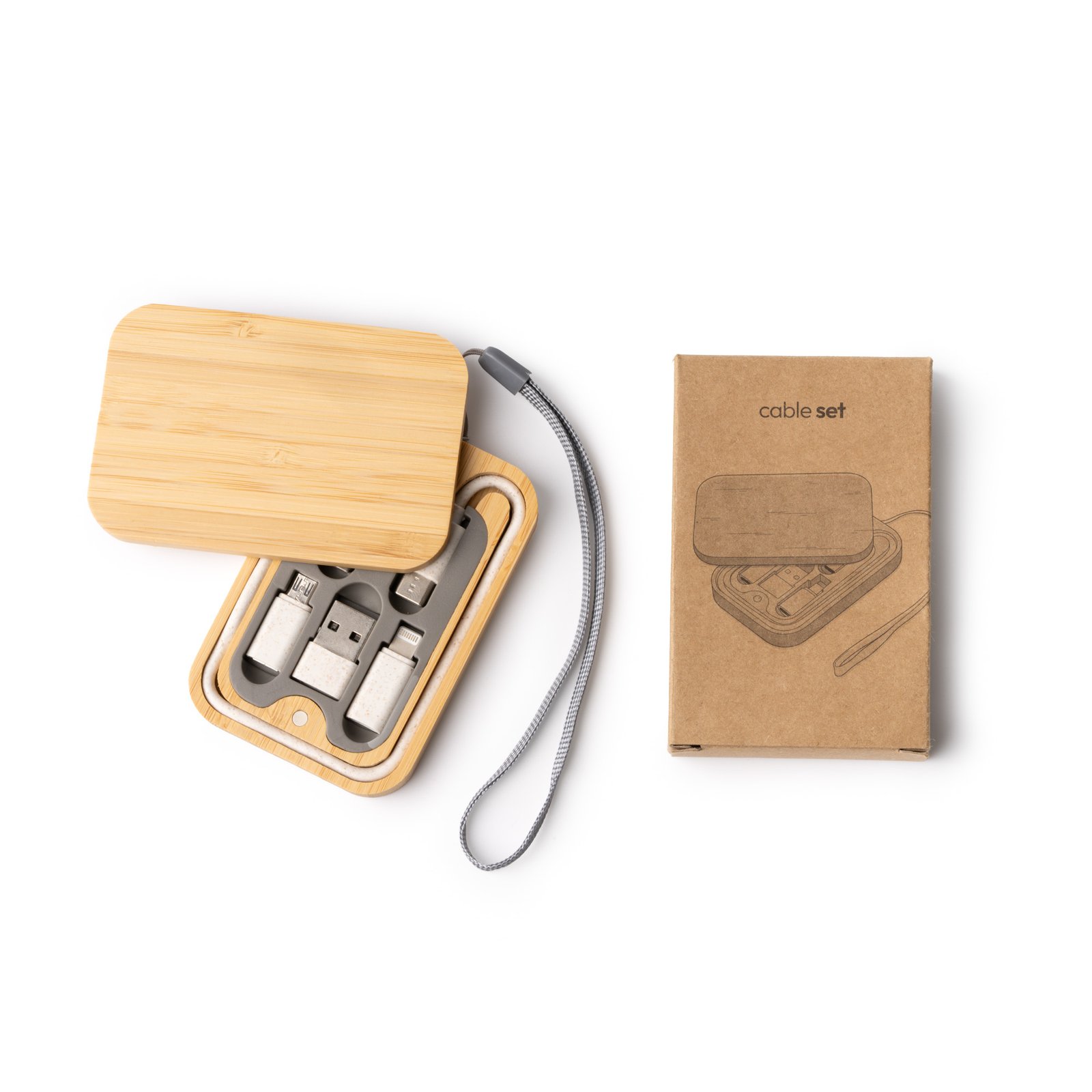 Set de cables cargadores realizados en fibra de trigo. Cable principal con clavijas de entrada y salida Tipo C con adaptadores Lightning, Micro USB y USB con función cargador y transferencia de datos. Presentados en estuche de bambú con tapa imantada. Incluye práctica asa para transporte.