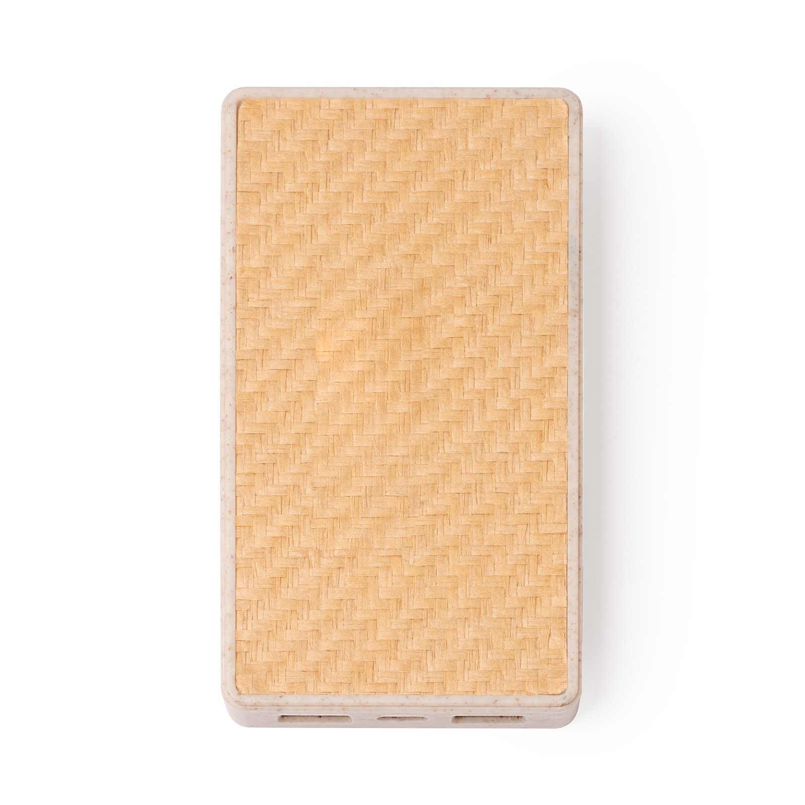 Batería externa recargable de 10.000mAh, con cuerpo elaborado en fibra de trigo y base de fibras naturales en la superficie. Con salidas USB, entrada Micro USB y entrada y salida Tipo C. Cuenta con indicador luminoso de carga e interruptor de encendido.