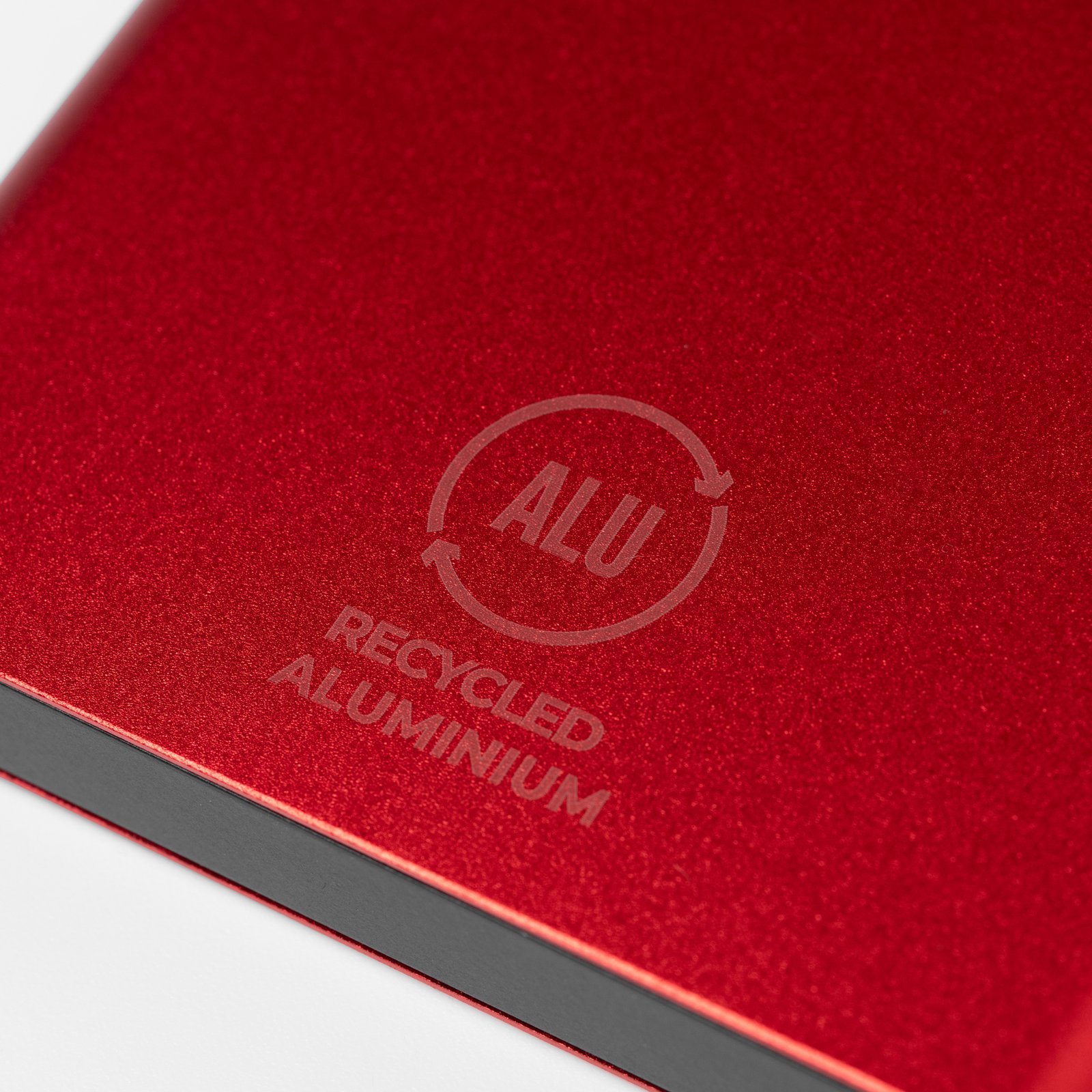 Batería externa de aluminio reciclado. Capacidad 4000 mAh. Incorpora indicador luminoso de carga. Cuenta con puerto USB de salida y puerto tipo C de entrada/salida.