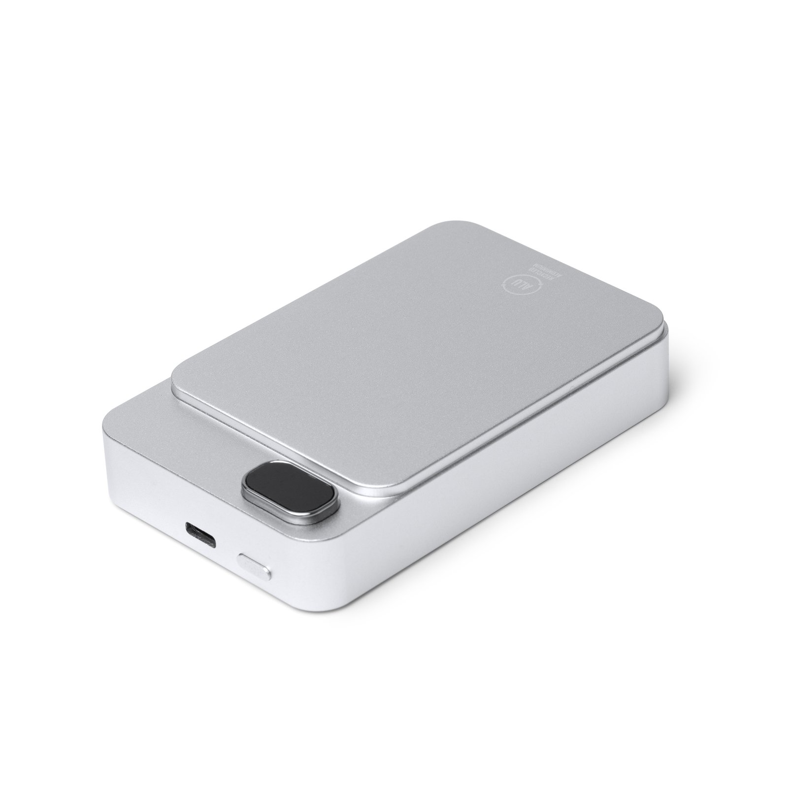 Batería externa magnética de 10000 mAh con cuerpo de aluminio reciclado. Con función de carga inalámbrica para dispositivos provistos de esta tecnología. Pantalla LED con indicador de porcentaje de carga. Puerto Tipo C de entrada y salida. Salida corriente 15W. Incluye cable tipo C y anillo magnético.