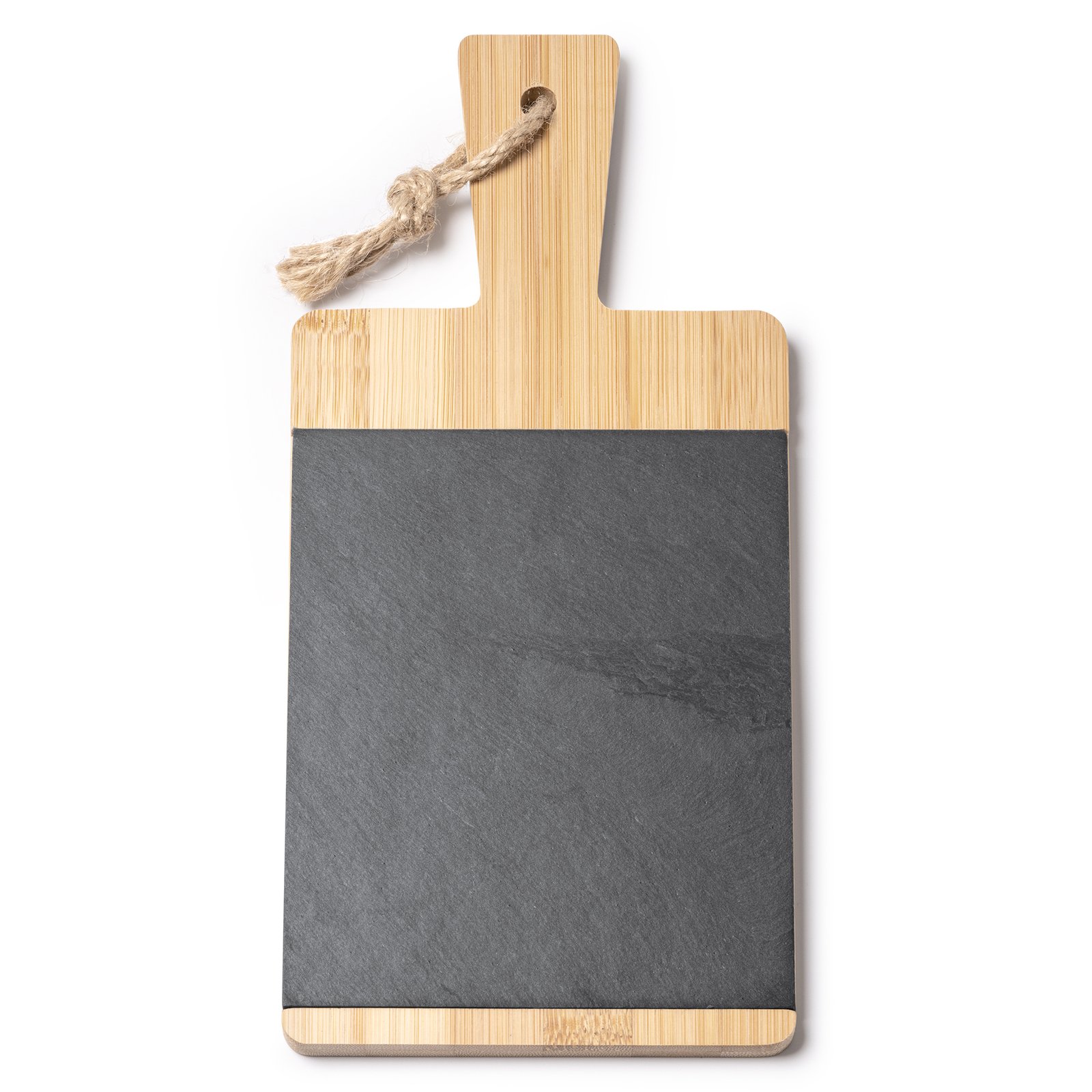 Tabla de cortar elaborada en bambú y pizarra, versátil y funcional para la cocina. Ideal para cortar y presentar alimentos. Este diseño combina la naturalidad y sostenibilidad del bambú con la elegancia de la pizarra, pensada para la presentación de alimentos. Incluye además una cuerda para colgarla, para mayor versatilidad en la cocina.