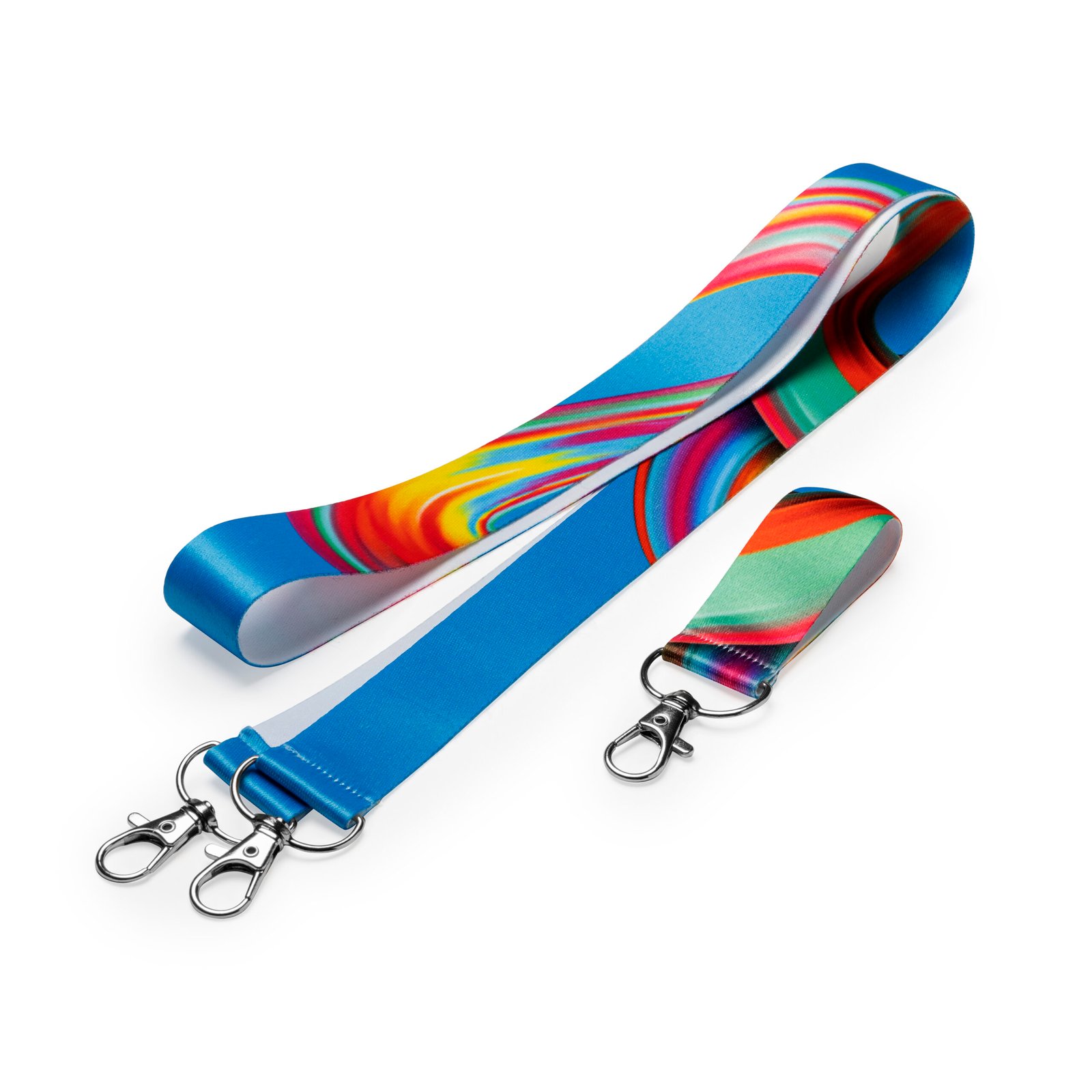 Lanyard de poliéster doble con mosquetón especial para sublimación. Este producto de confección se realiza bajo pedido. Stock permanente. Composición: