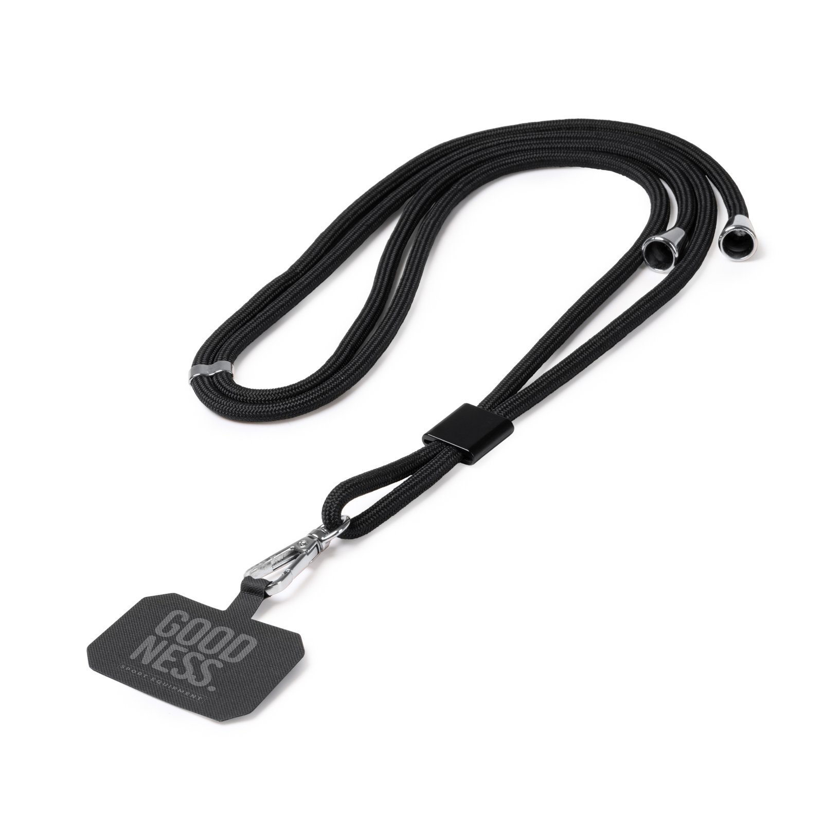 Lanyard portamóvil de poliéster reciclado RPET. Con cinta ajustable y mosquetón incluido.