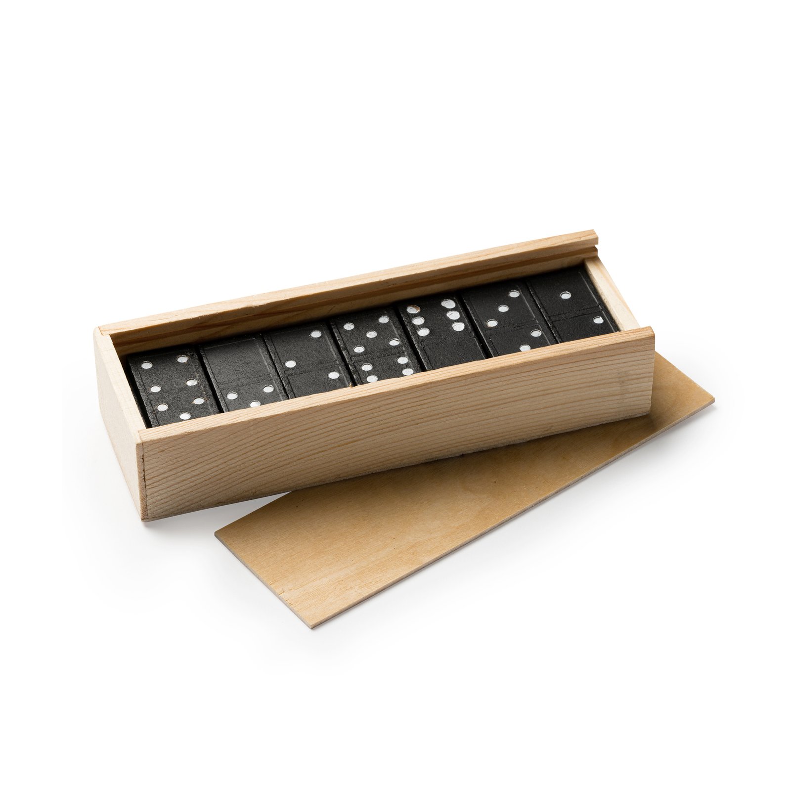 Juego de dominó realizado en madera. 28 piezas presentadas en caja con tapa deslizante.