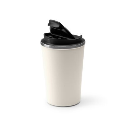 Taza de acero inoxidable 304 reciclado de doble pared. Con capacidad de 350ml. Cuenta con tapa dosificadora a rosca y