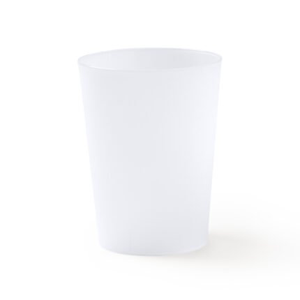 Vaso reutilizable de PP flexible con capacidad 400ml. Acabado translúcido.Composición: PP flexibleObservaciones: Impresiones a más de un color disponibles mediante