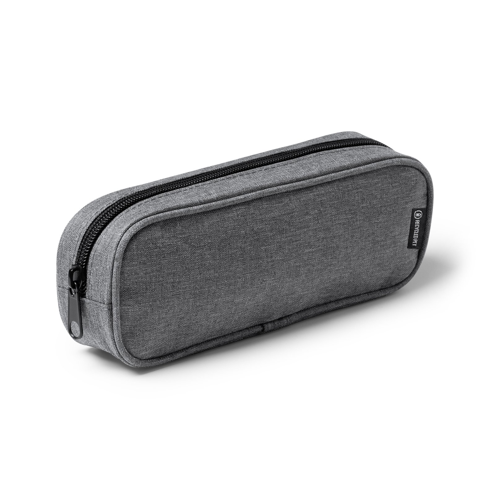 Estuche rectangular elaborado de material RPET 600D procedente de botellas recicladas. Cuenta con cremallera a juego y cintas tiradoras en