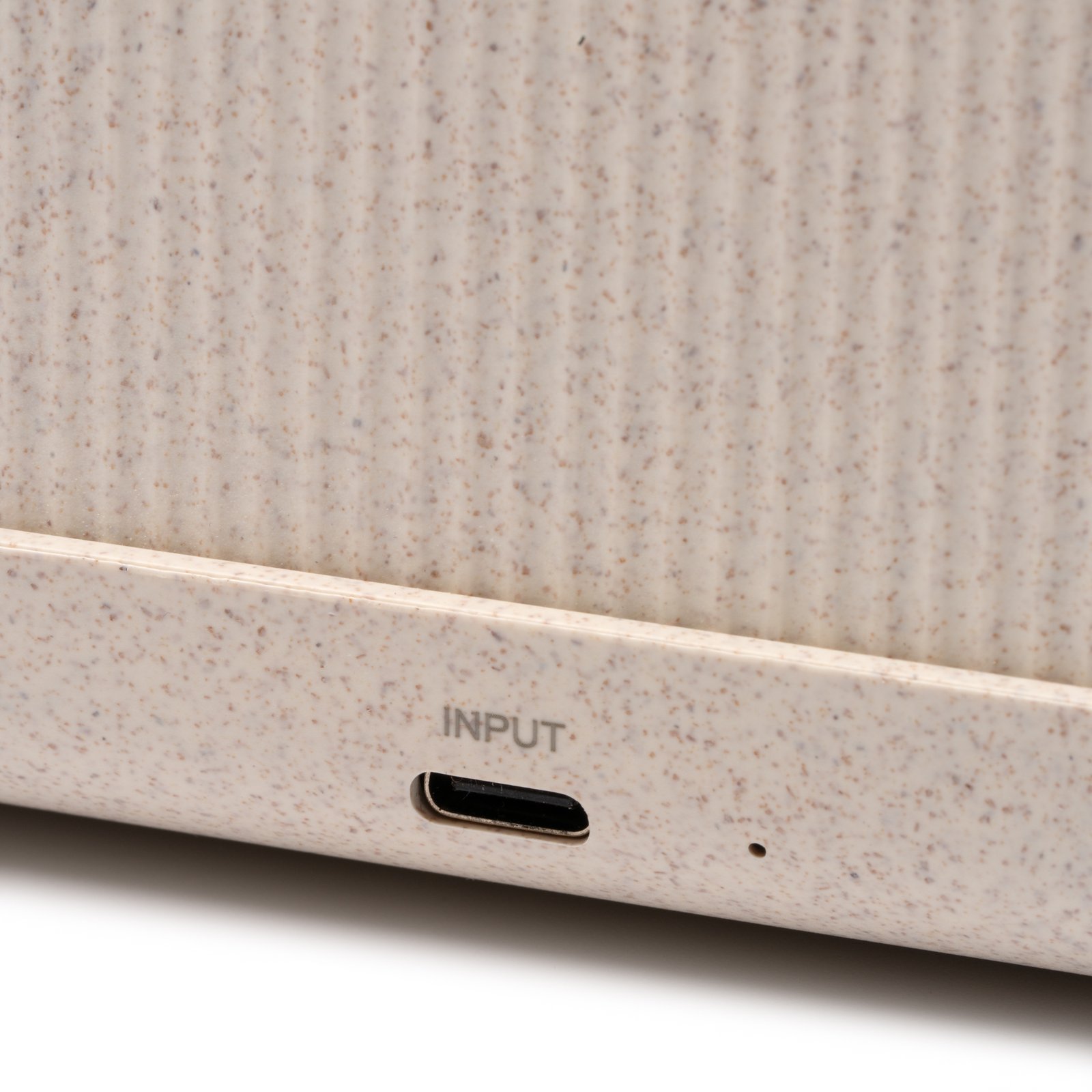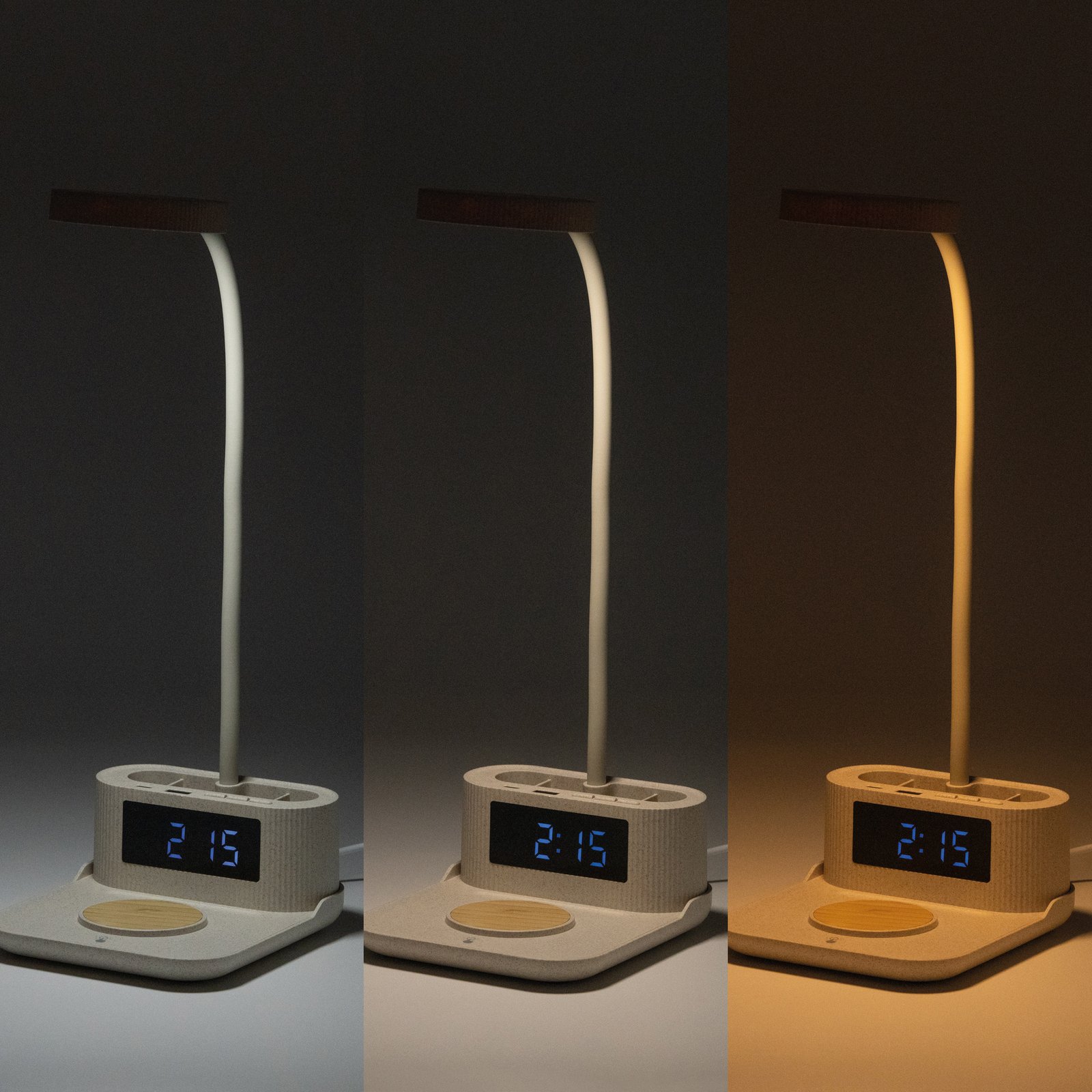 Lámpara cargador multifunción, fabricada en fibra de trigo y bambú. Con tres tipos de luz distintos: brillante, suave y cálida. Con diferentes niveles de intensidad ajustables mediante botón multifunción, aumentando y disminuyendo la graduación de esta. Cuenta con base carga inalámbrica de 15W de potencia para dispositivos compatibles con esta tecnología. Incorpora reloj con alarma, con posibilidad de ajustar ésta simultáneamente mediante los botones multifunción. En su base incorpora un lapicero organizador, un puerto USB de salida Tipo C y un puerto USB estándar. El cuerpo de la lámpara plegable para mayor comodidad.