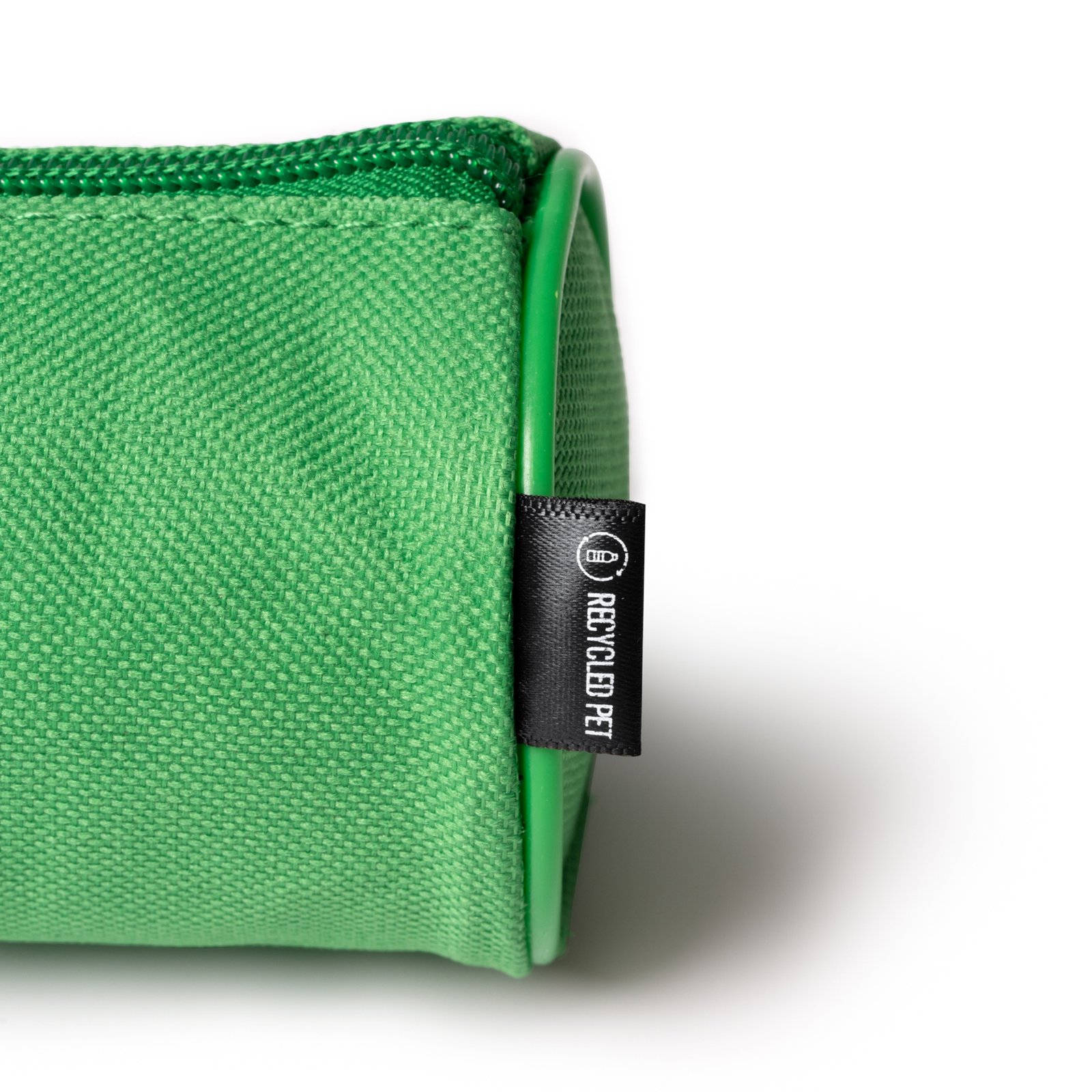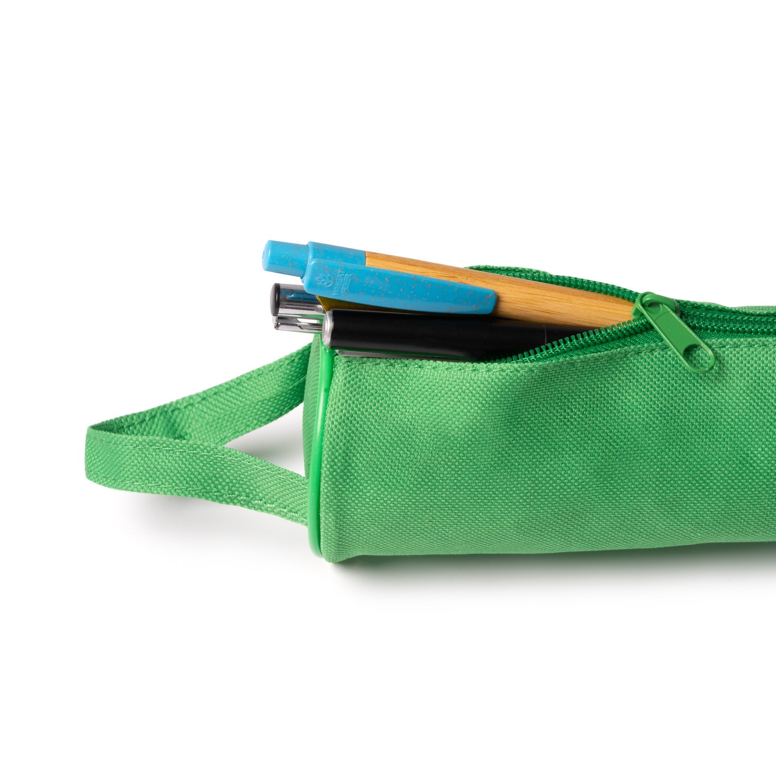 Estuche cilíndrico realizado en políester reciclado RPET 600D en colores lisos y cremallera a juego.