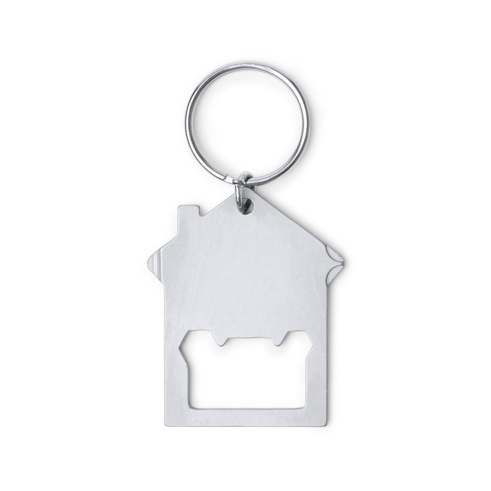 Llavero multiherramienta elaborado en acero inoxidable con diseño en forma de casa. Cuenta con funciones abridor, destornillador de estrella y plano en sus laterales, llave Allen de tamaños M3 y M4 en los laterales de su abertura central.