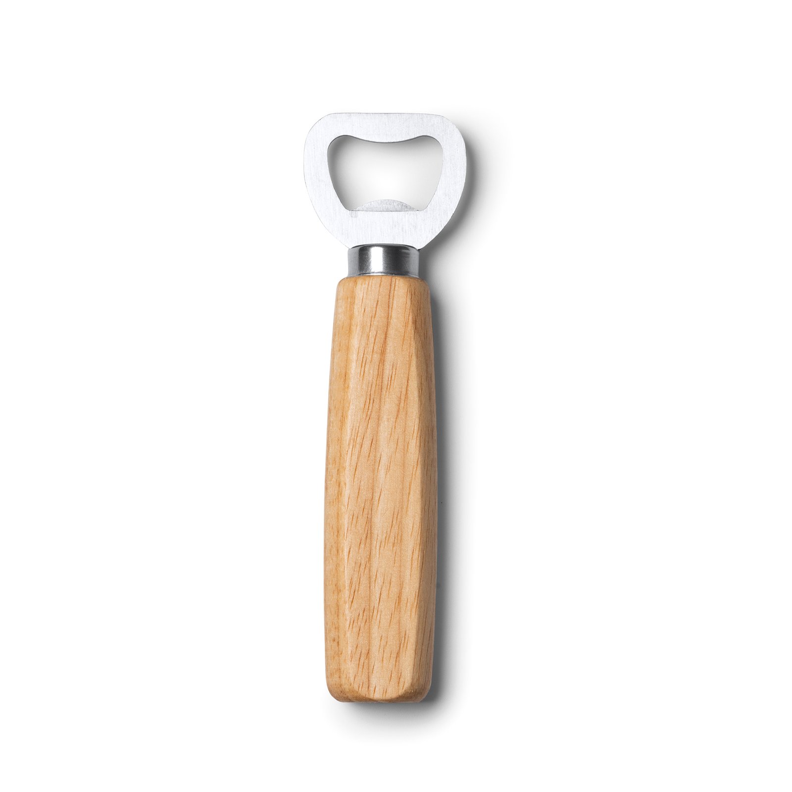 Abridor de acero inoxidable con empuñadura de madera natural.