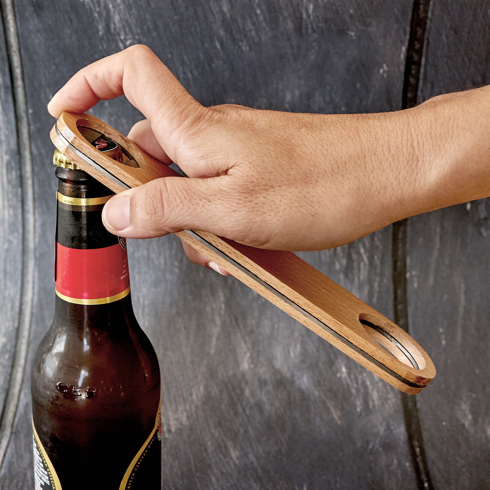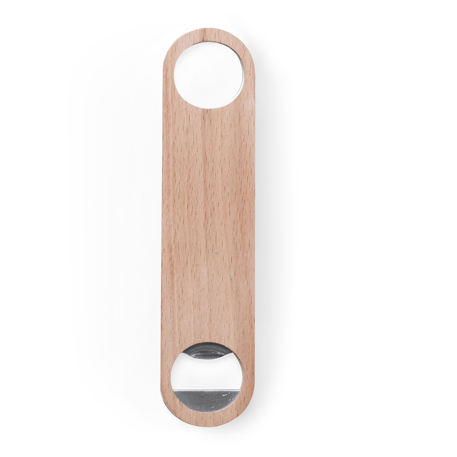 Abridor alargado con un orificio en cada extremo: uno con función abridor y otro como colgador. Realizado en madera natural con interior de acero inoxidable.