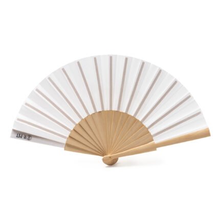 Abanico con varillas de madera y tela en RPET. Idóneo para tener aire fresco los días calurosos de verano. Composición:
