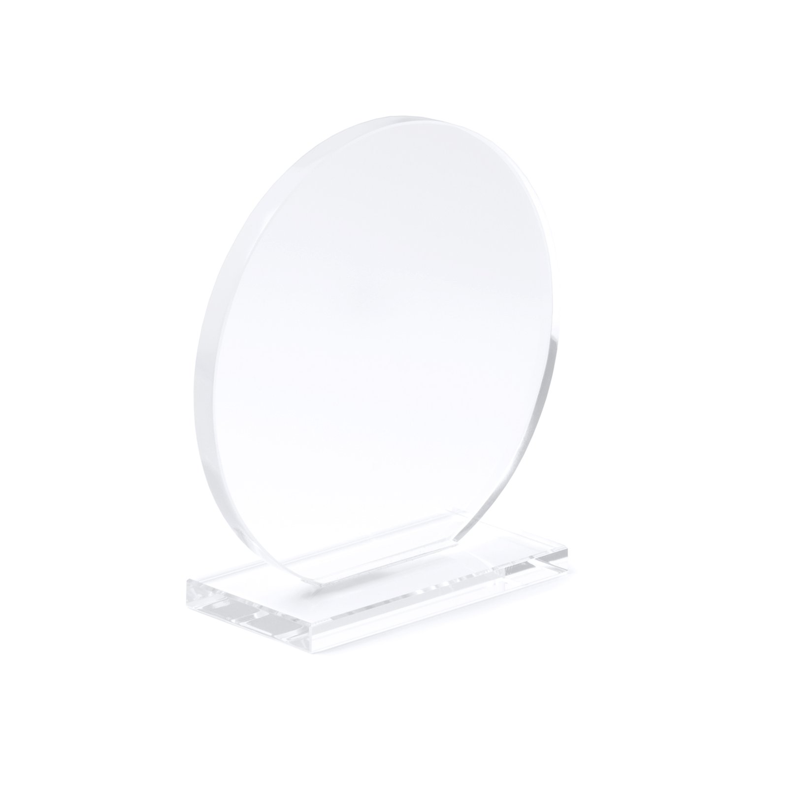 Trofeo de cristal de diseño circular con base rectangular. Incluye estuche de presentación con base acolchada en color negro. Composición: