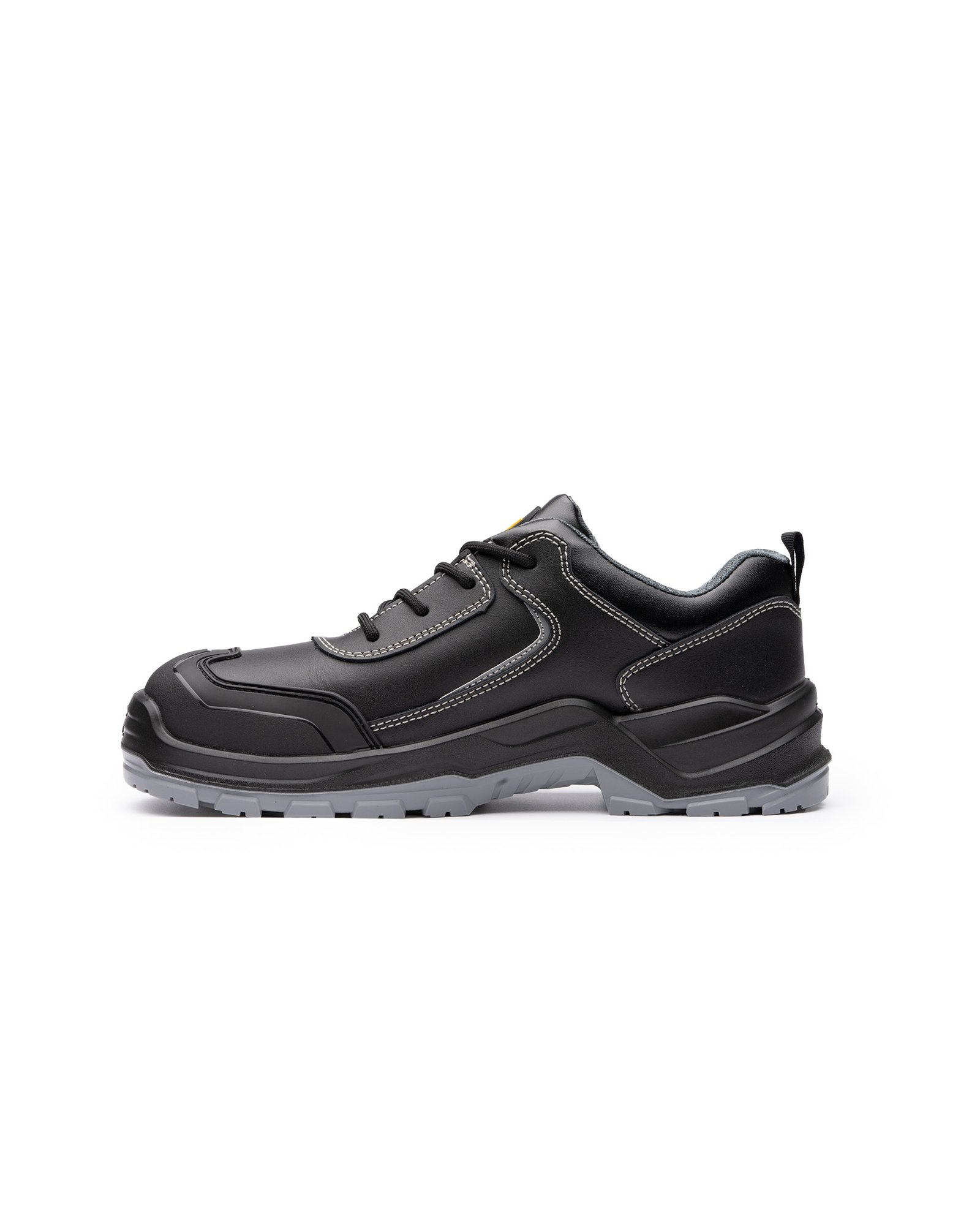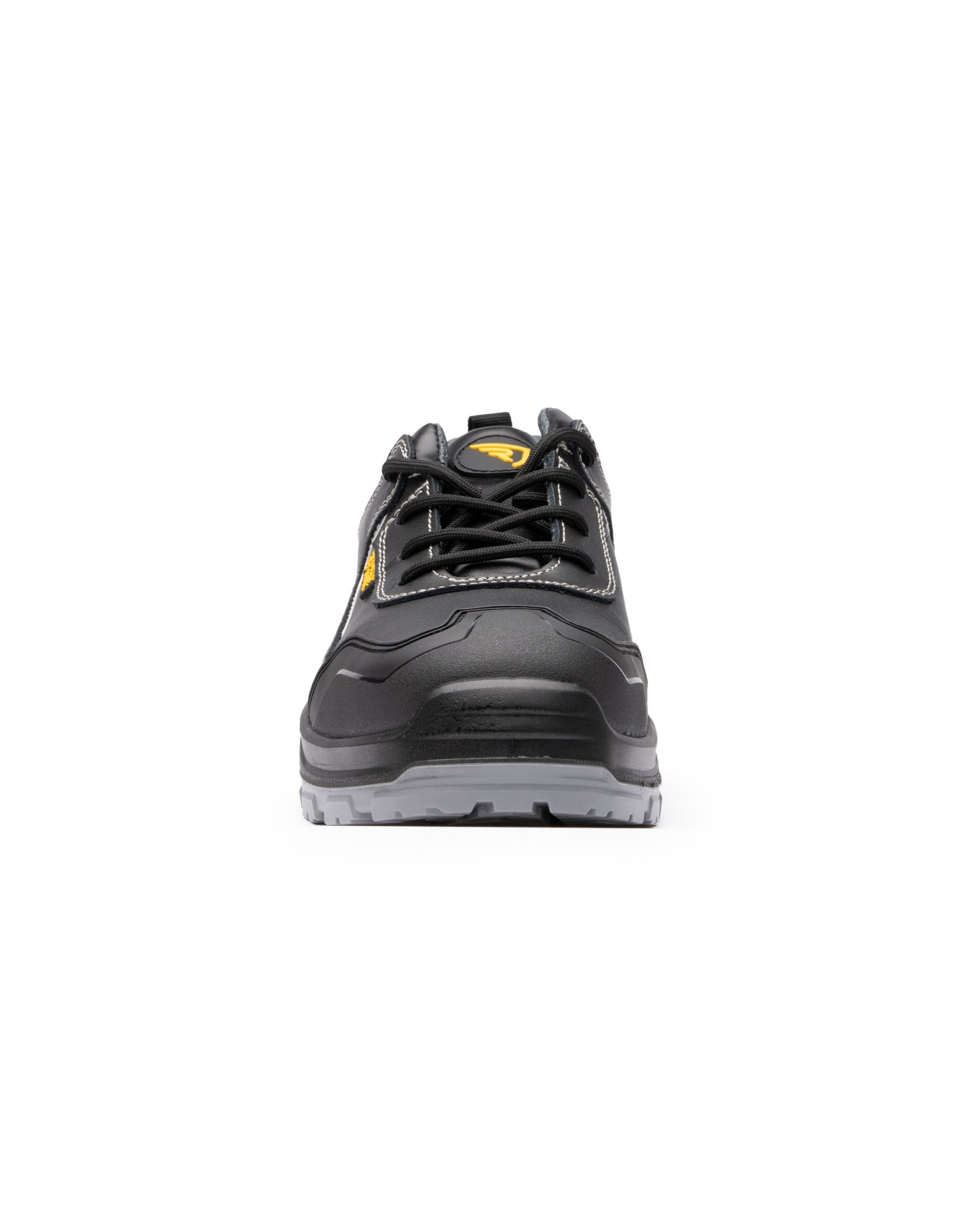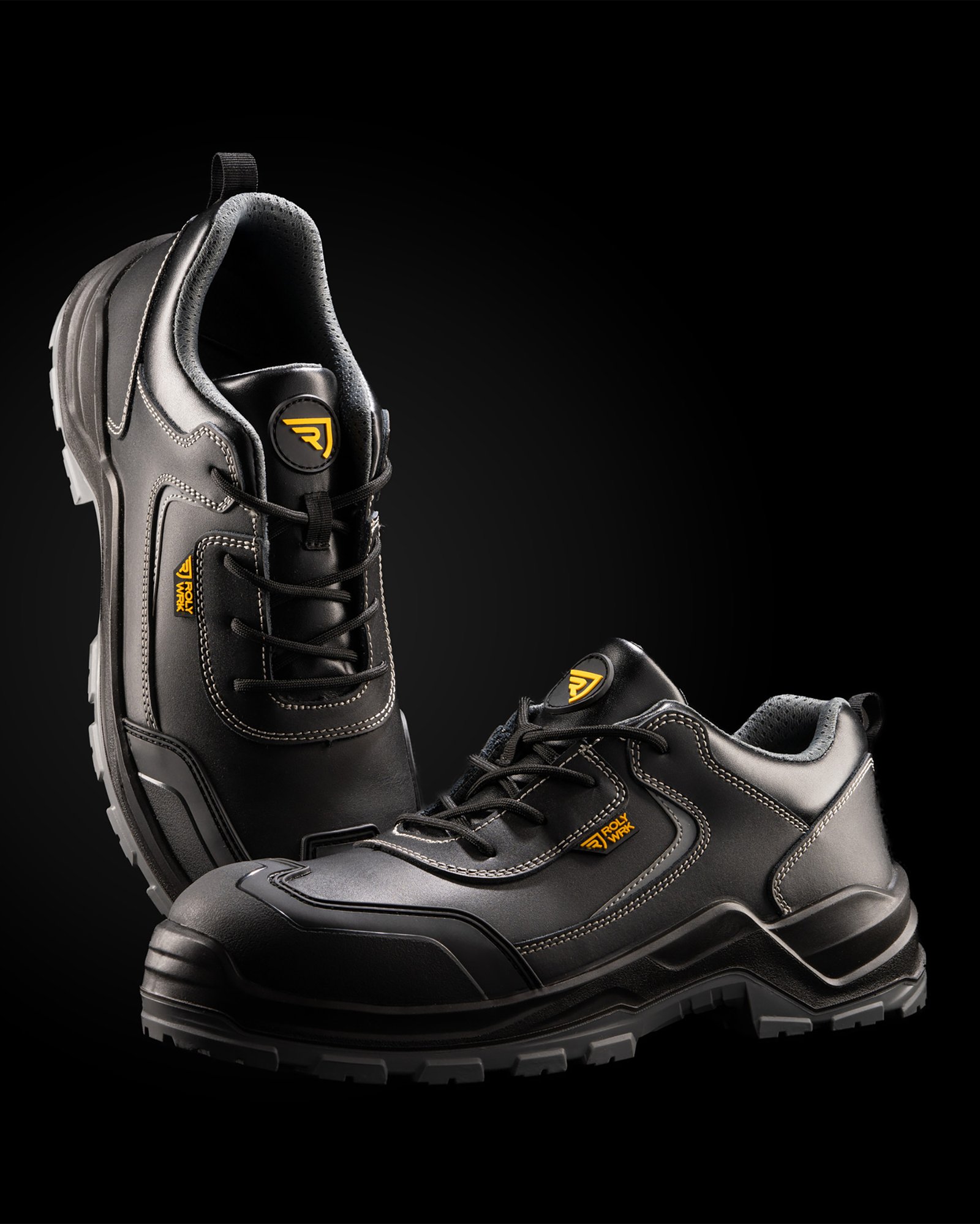 Calzado laboral con recubrimiento de piel y tejido mesh, ofrece durabilidad, comodidad y transpirabilidad.