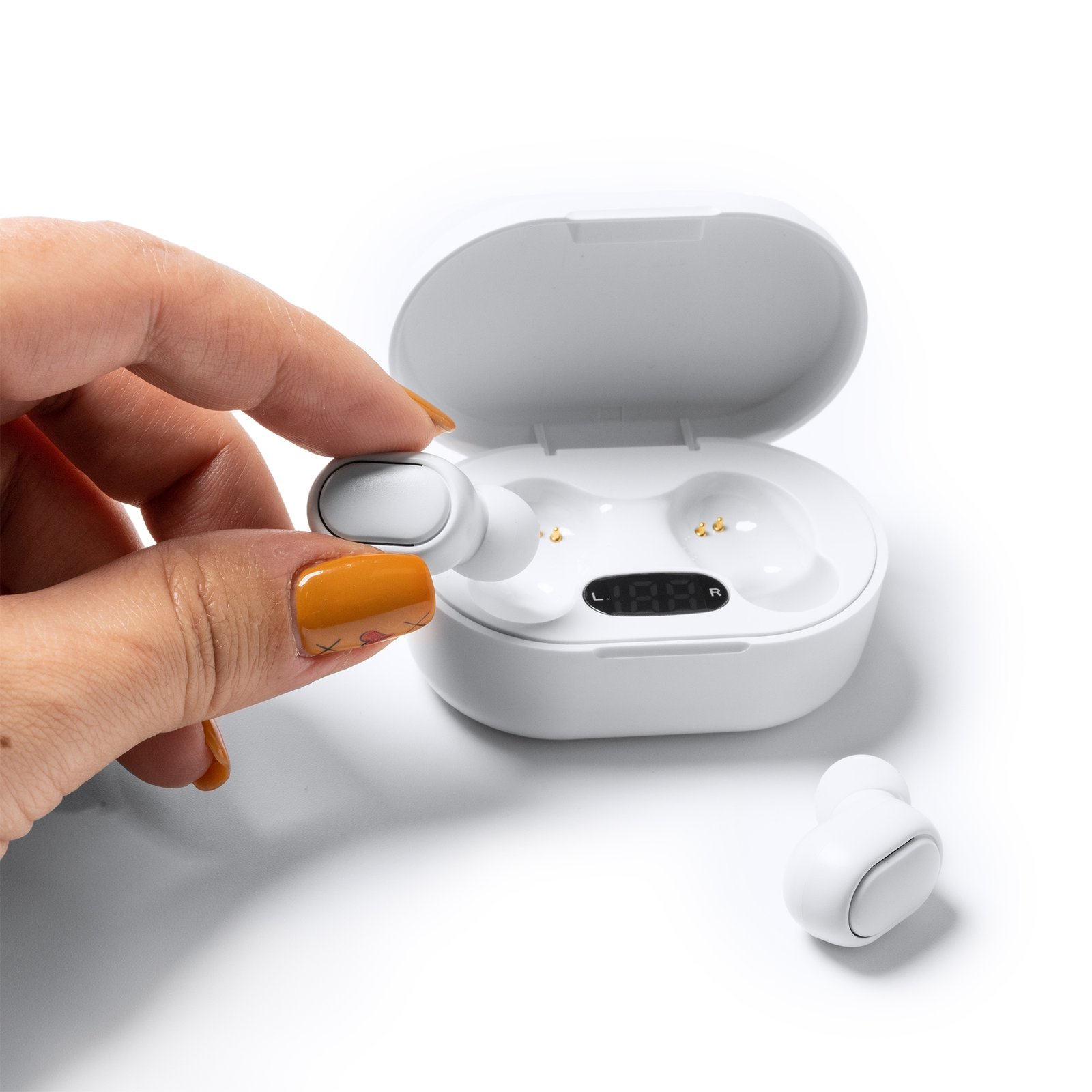 Auriculares inalámbricos recargables en estuche con pantalla digital. Conexión mediante Bluetooth. Cuenta con control de reproducción de audio, con funciones de control de volumen y pistas y función manos libres con botón multifunción en ambos auriculares para responder y rechazar llamadas. La pantalla digital cuenta con indicador de batería del estuche.
