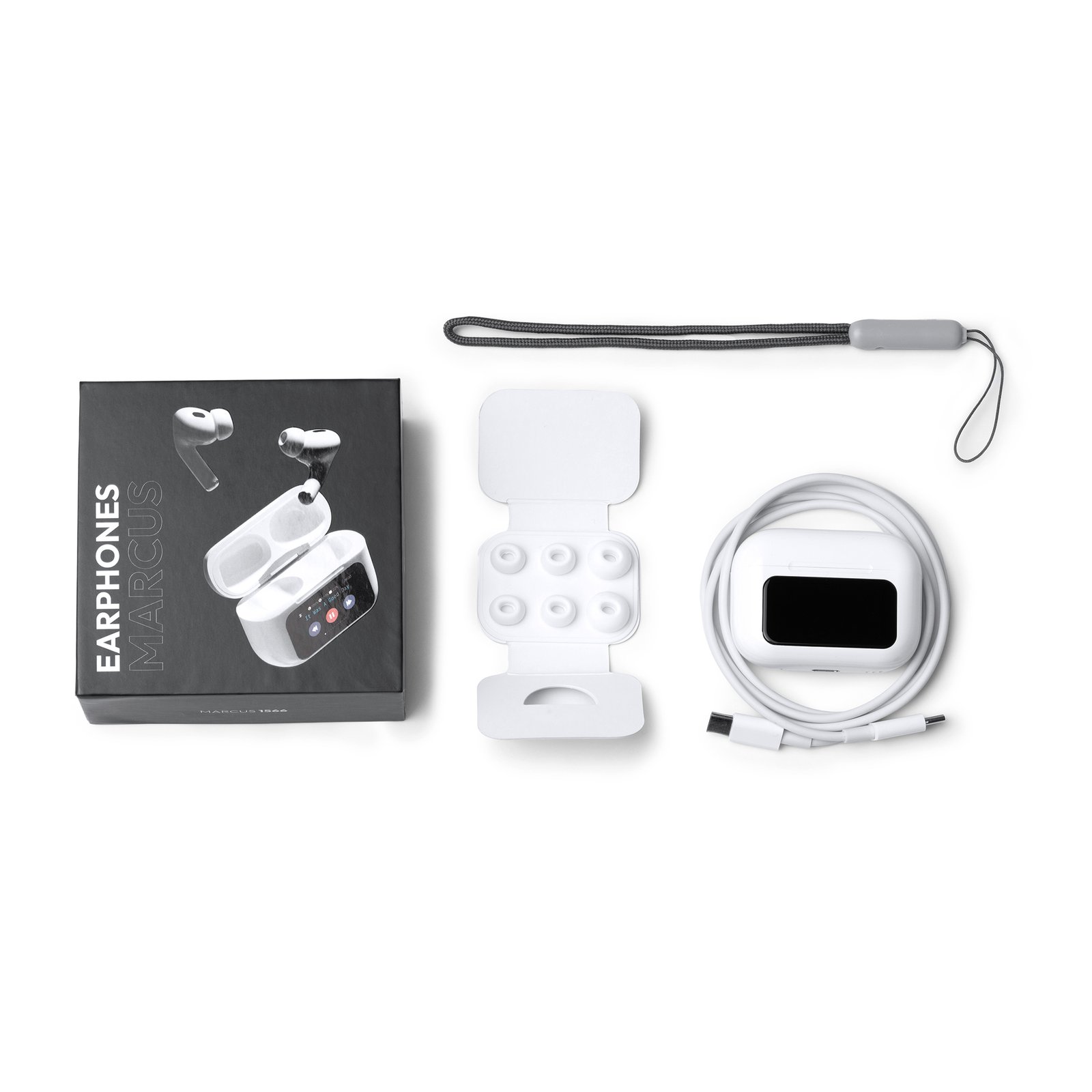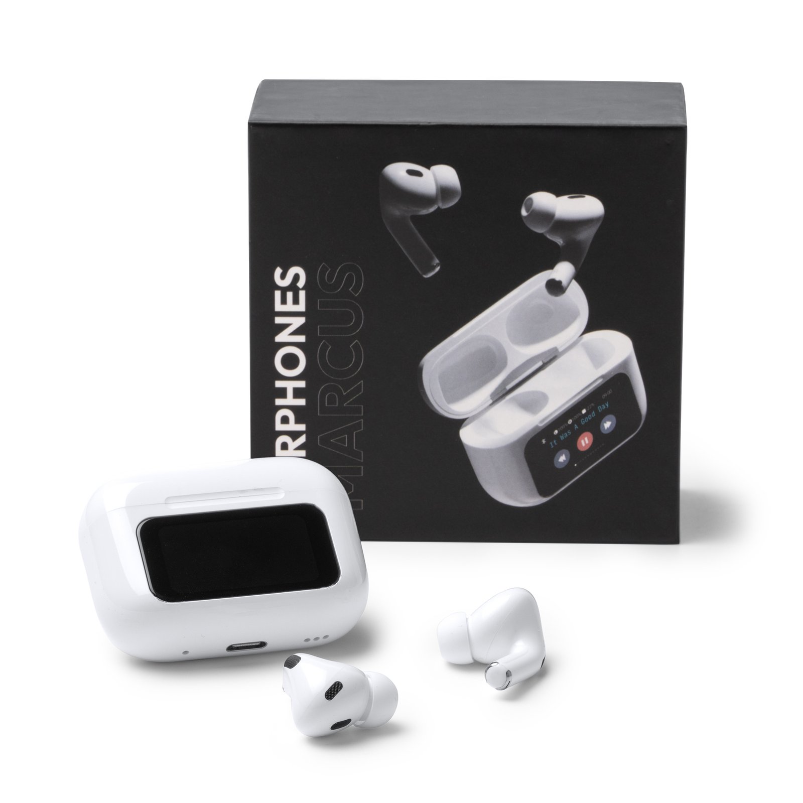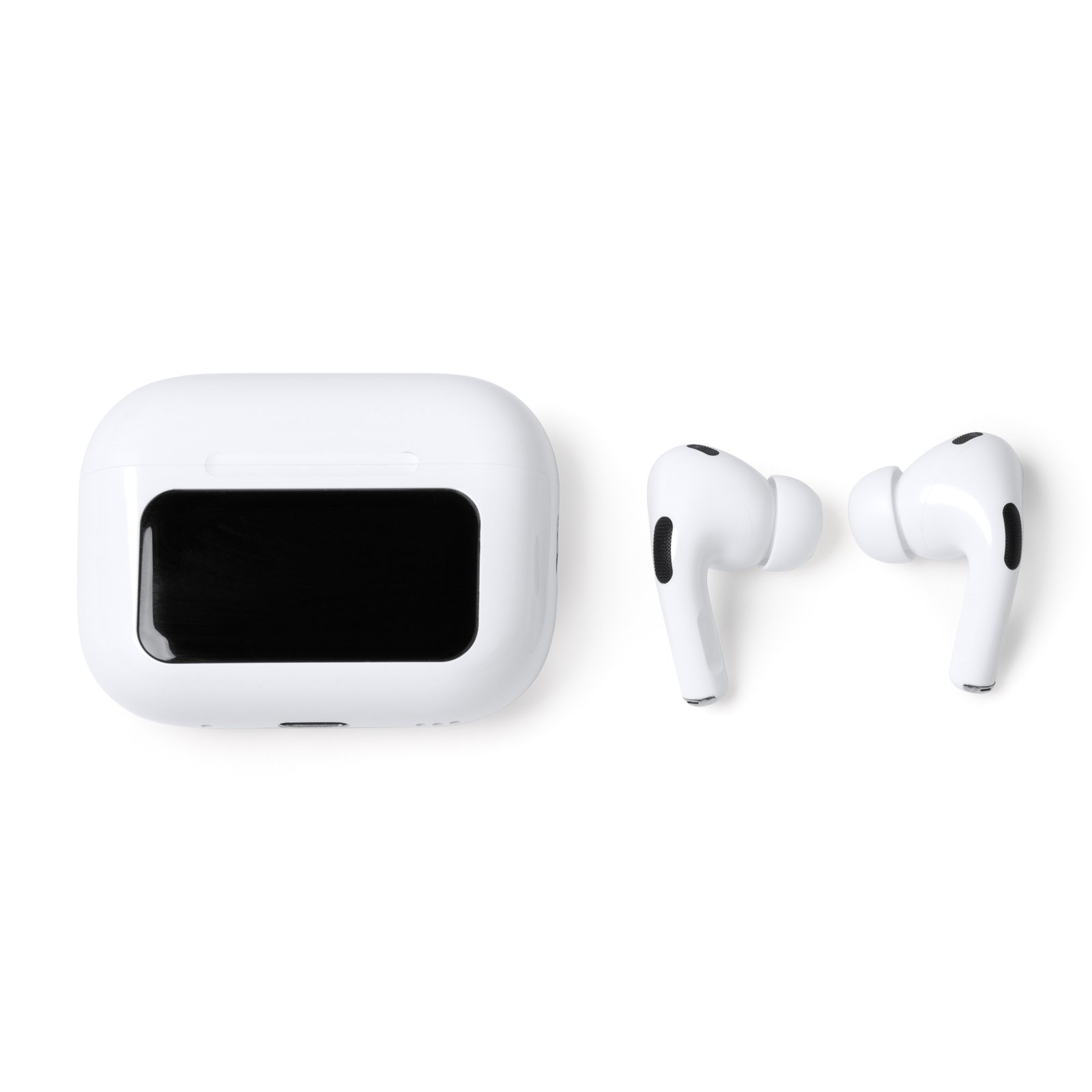 Auriculares inalámbricos con estuche equipado con pantalla táctil. Cuenta con función cancelación de ruido y selección de modos de ecualizador. También cuenta con función asistente de voz mediante botón lateral del auricular y función de búsqueda del auricular, hacer foto y linterna. Con opción de vinculación con redes sociales con contenido audiovisual y función de «Me gusta» mediante la pantalla táctil. Pantalla en 16 idiomas disponibles.