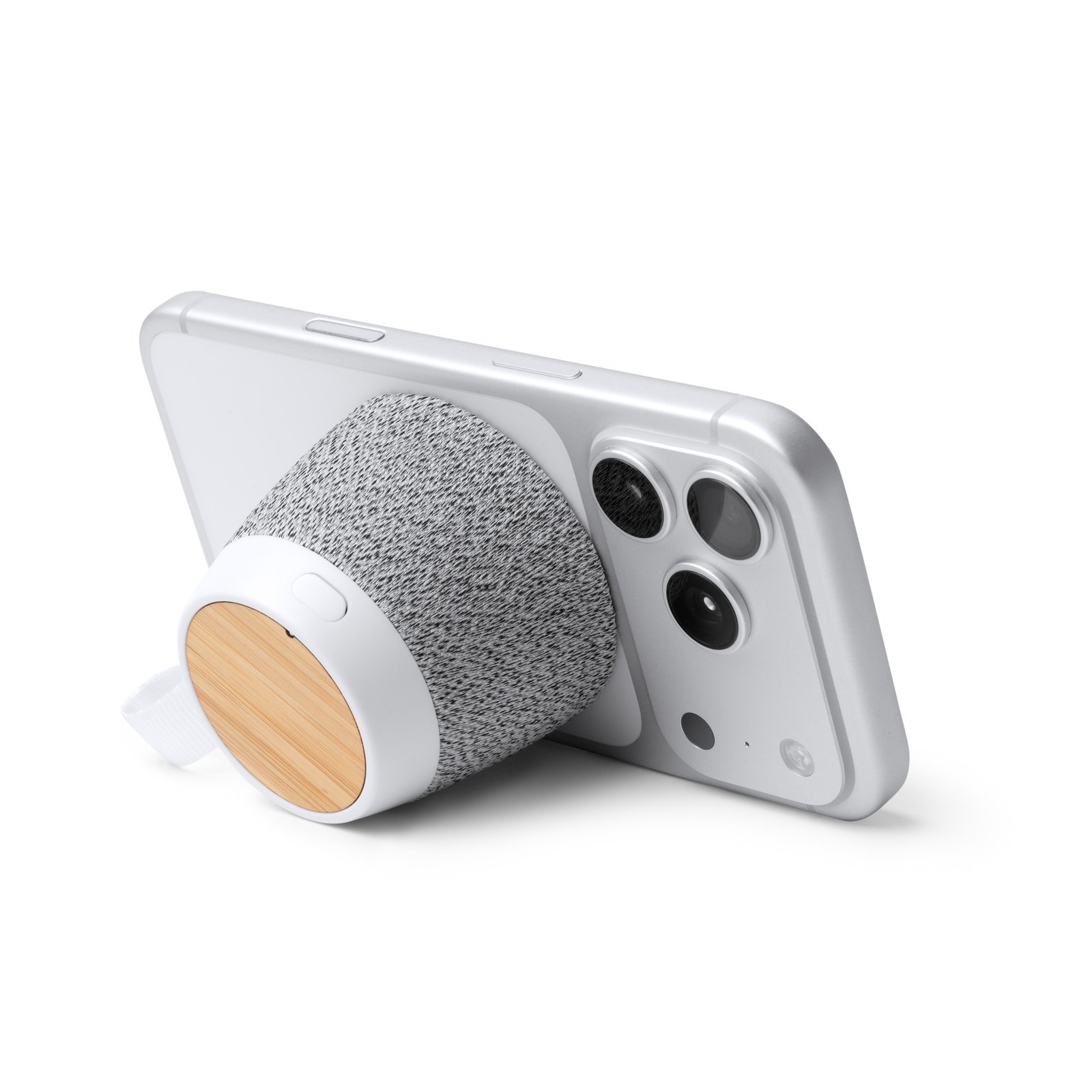 Altavoz inalámbrico con cuerpo elaborado en bambú y tejido en RPET con potencia 5W y con batería con capacidad 300mAh. Cuenta con salida de audio mediante conexión Bluetooth y manos libres, además incluye un anillo magnético que lo convierte en soporte para smartphone haciéndolo más versátil en su uso. Incorpora un asa de transporte.
