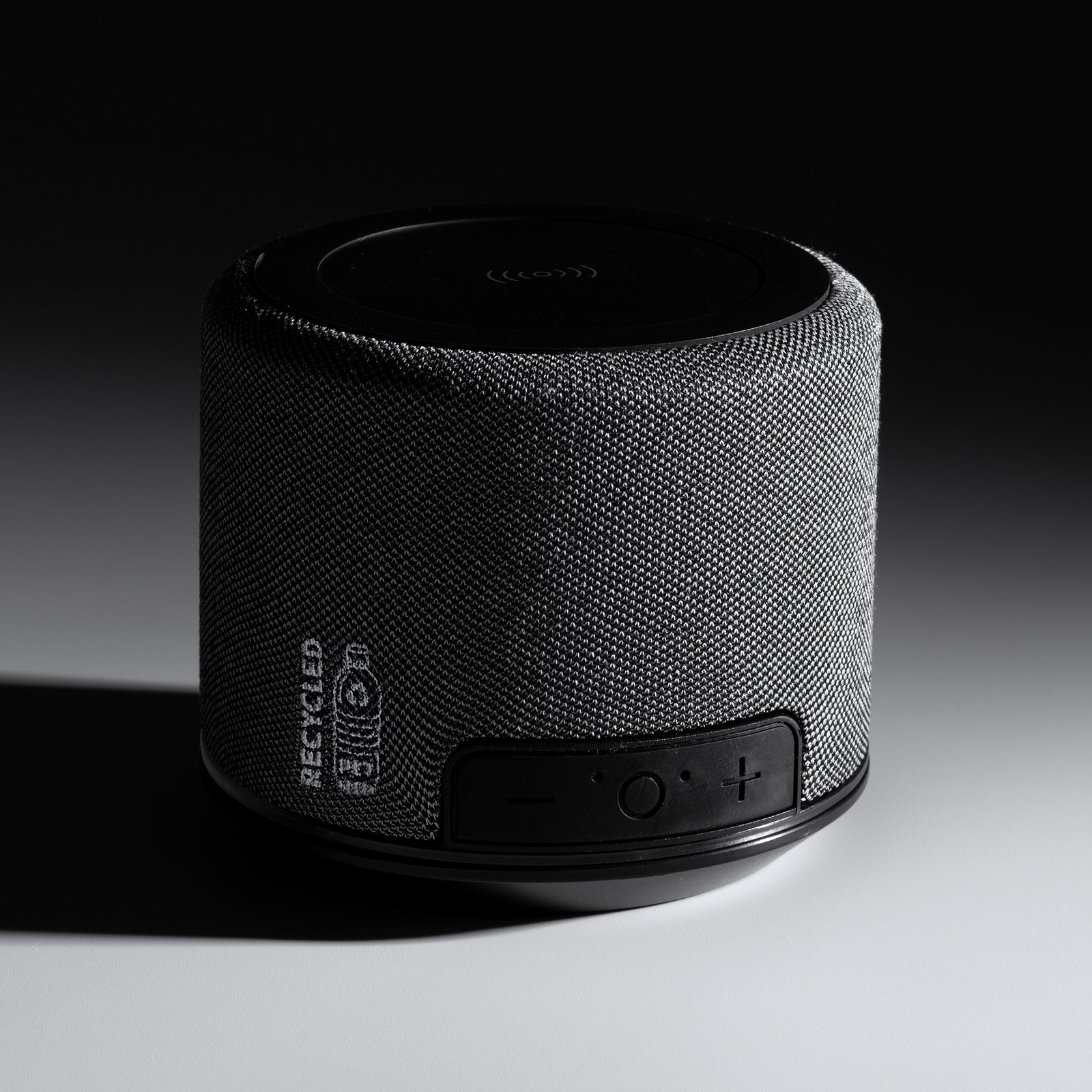 Altavoz inalámbrico con un bonito diseño realizado con tejido ecológico RPET y atractivo diseño. Base de carga inalámbrica (5W). Potencia 3W. Conexión Tipo C. Cable incluido.