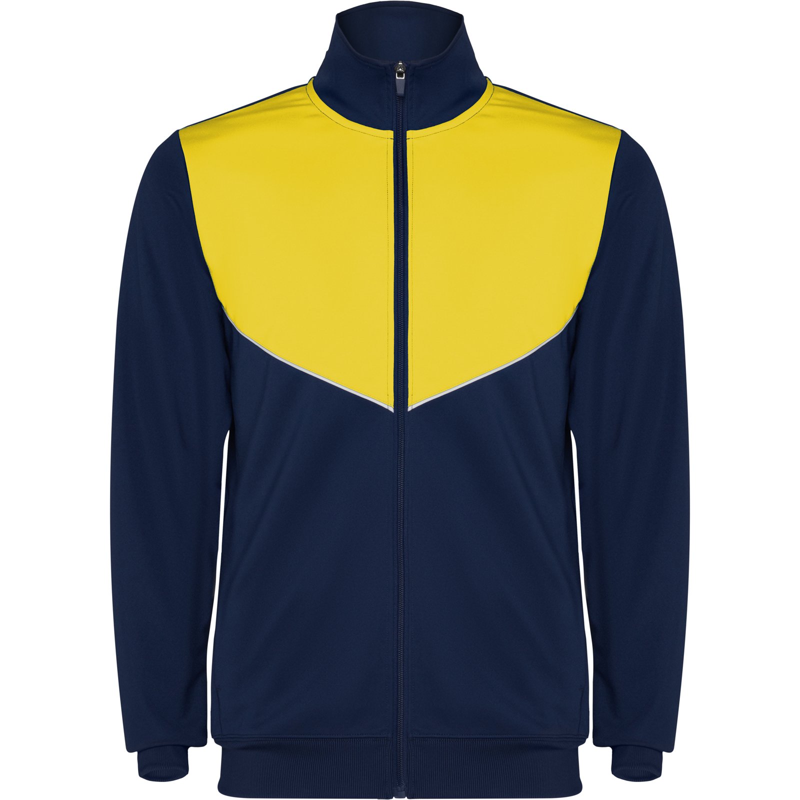 Chaqueta deportiva con cremallera frontal perchada. Bolsillos laterales con cremallera. Piezas a contraste de color, una blanca en pecho especial