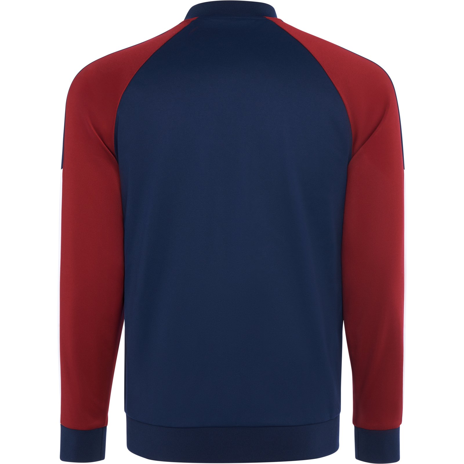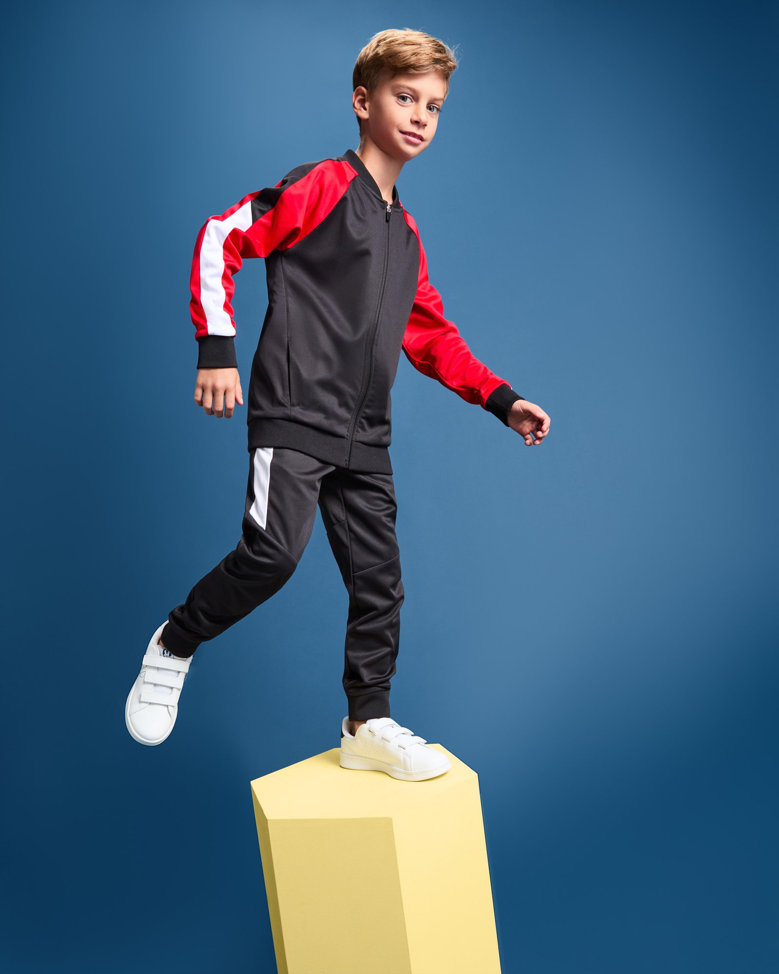 Chaqueta deportiva manga ranglán. Cremallera frontal. Dos bolsillos laterales con cremallera. Rib 1×1 en cuello, puños y bajo. Cubrecosturas a contraste. Mangas a contraste de color con bandas a lo largo de la manga. Opciones de color para combinar con pantalón URUS.