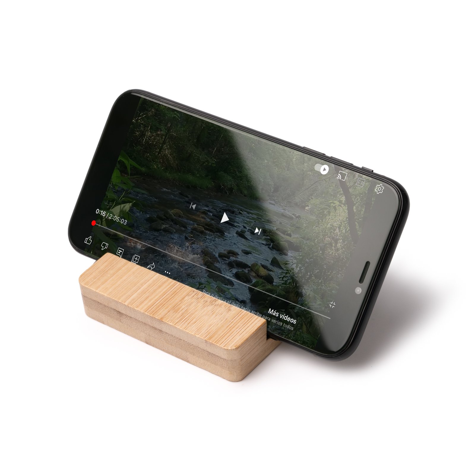Soporte de bambú para móviles. Perfecto para cargar tu Smartphone de forma cómoda. Ranura inferior para cable de carga. Incluye