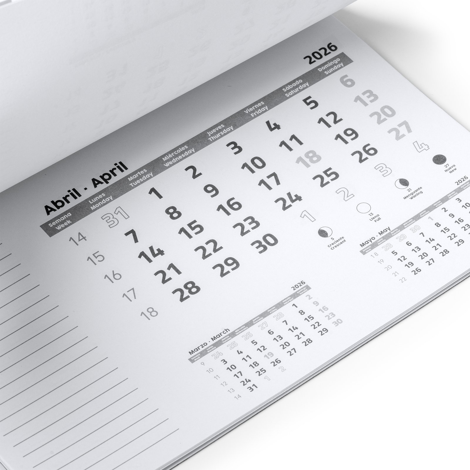 Alfombrilla rectangular para ratón con calendario. Cubierta de un color y transparente, tras la que se puede ver la hoja del mes correspondiente. La cubierta se levanta para acceder al calendario de 12 hojas en español e inglés, cuyas hojas se arrancan. En cada hoja mensual, aparece el mes en curso, el anterior y el posterior. Base antideslizante negra. Gramaje del papel 80 g/m². Grosor de la cubierta 0,3 cm.