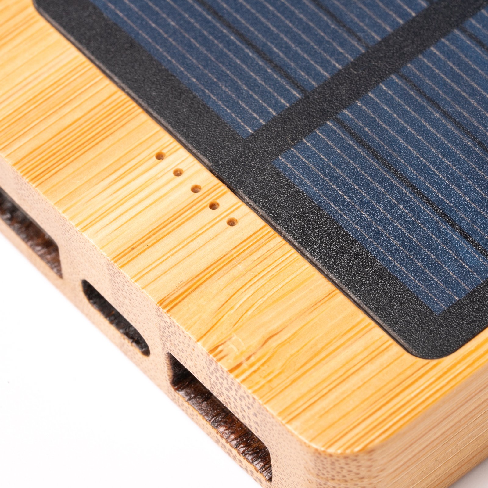 Batería externa solar de 4000 mAh realizada en bambú. Puerto de entrada y salida tipo C y dos puertos USB de salida.Con indicador luminoso de carga. Recarga de batería mediante cable tipo C, incluido, o mediante luz solar.