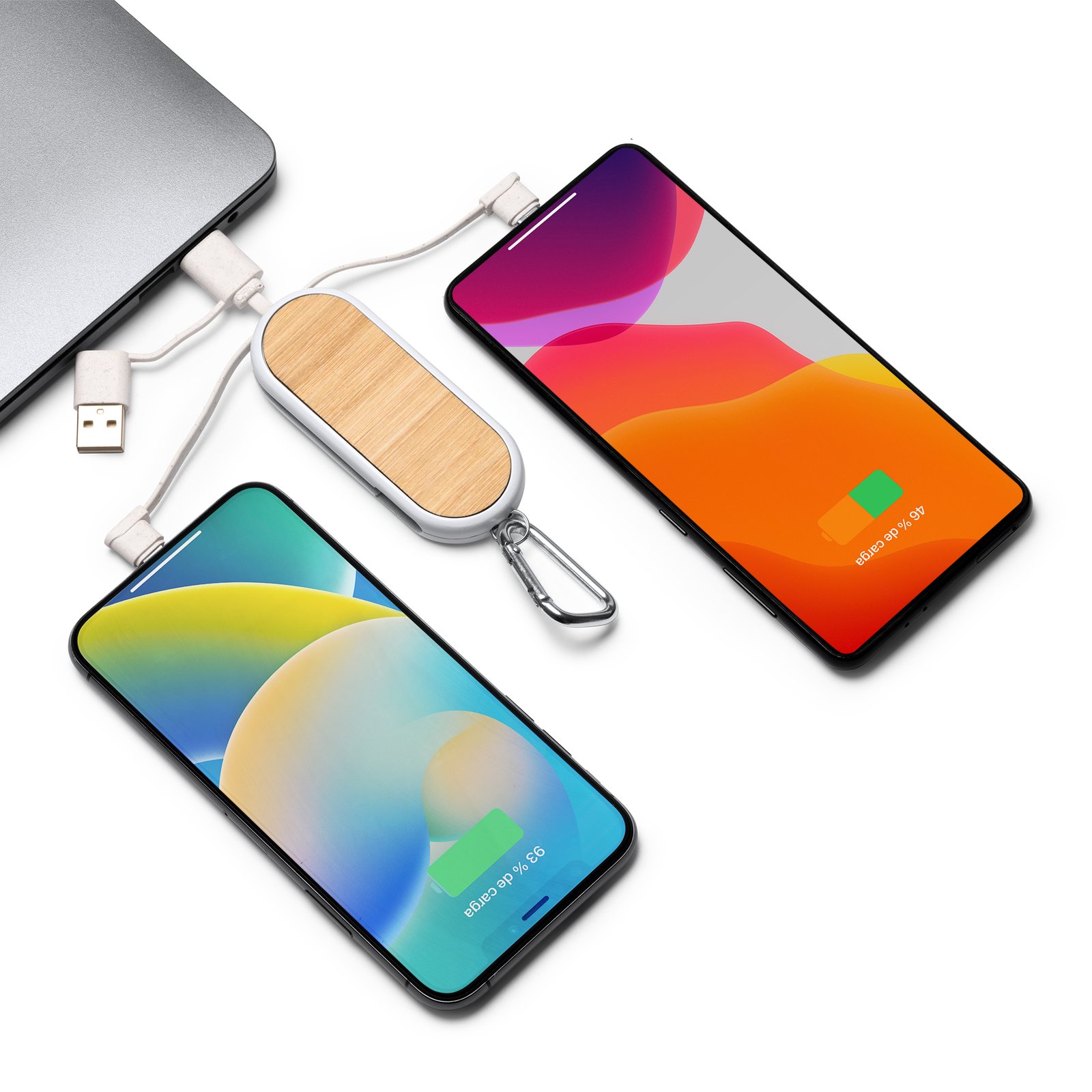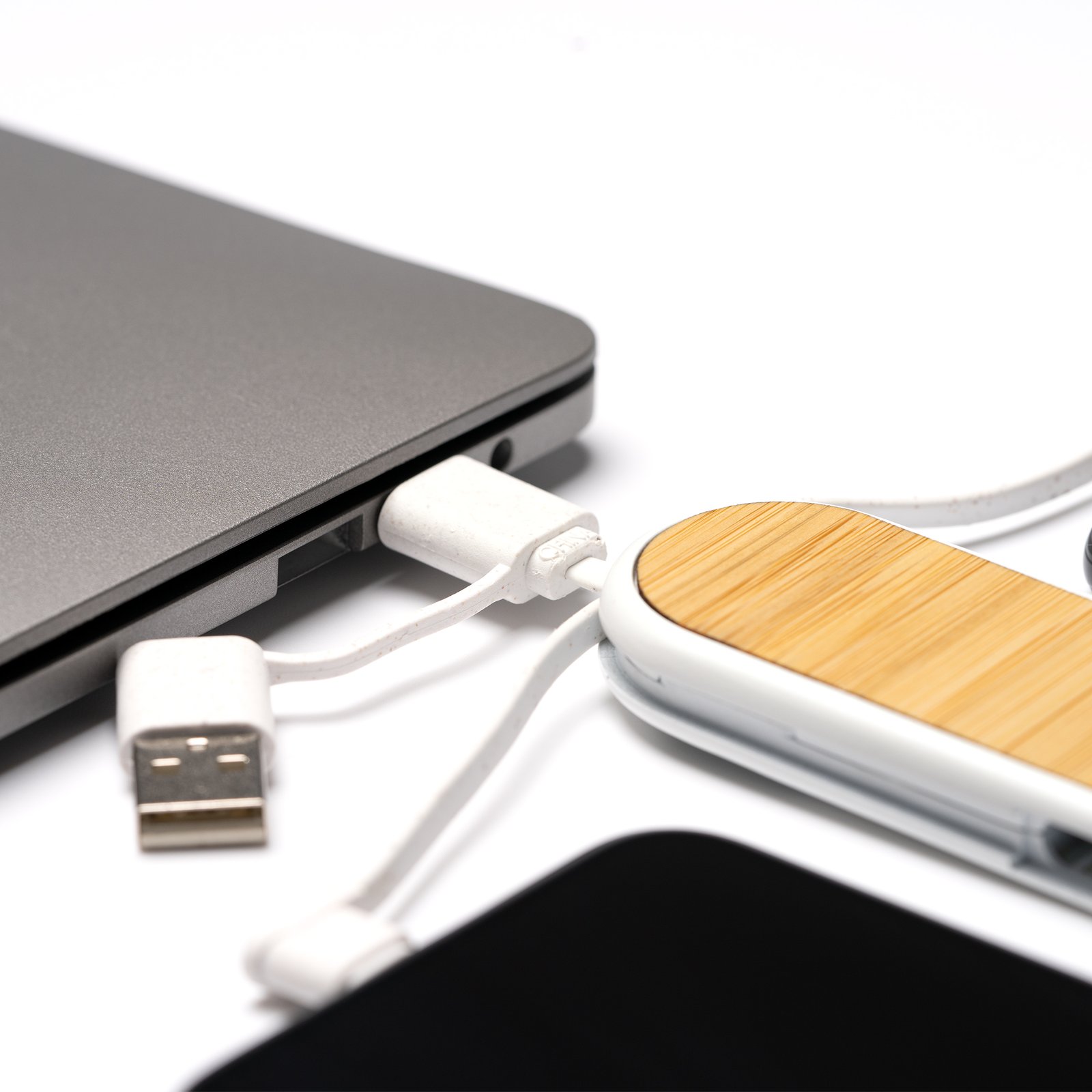 Cable cargador 4 en 1, con cuerpo fabricado en fibra de trigo y superficie en bambú. Cables también en fibra de trigo. Cuenta con múltiples conexiones: entrada USB y Tipo C, y salidas Micro USB, Tipo C y Lightning. Aspecto compacto gracias a las ranuras de guardado de los cables. Con mosquetón incorporado.