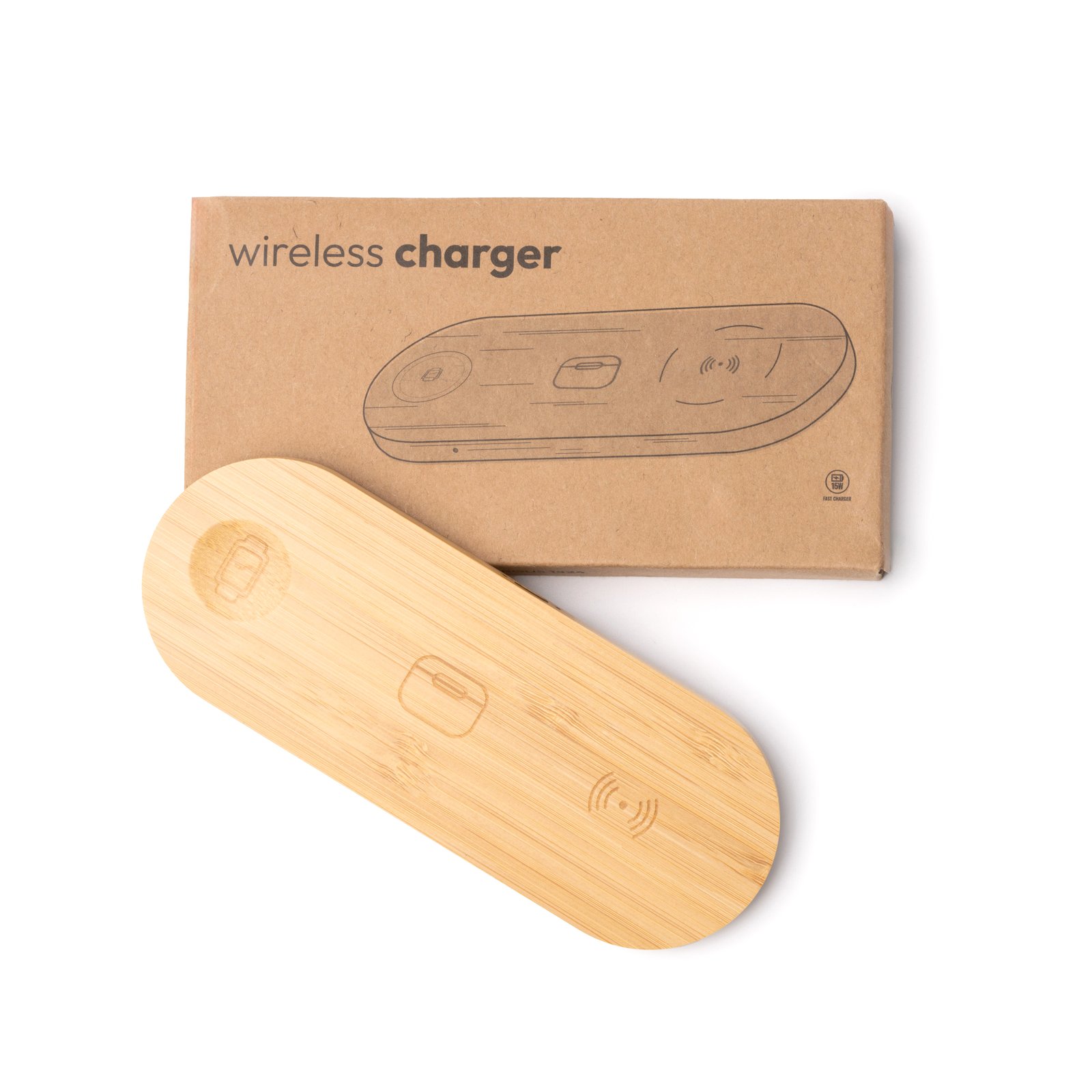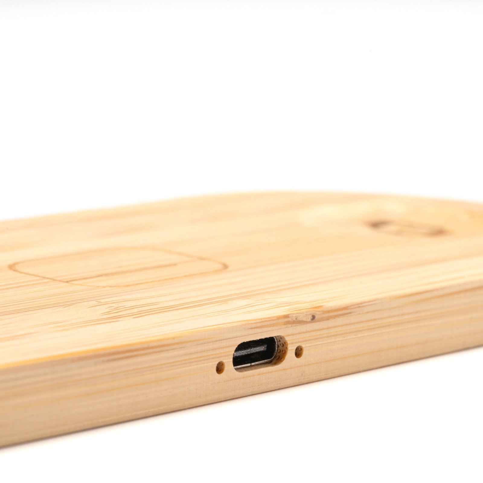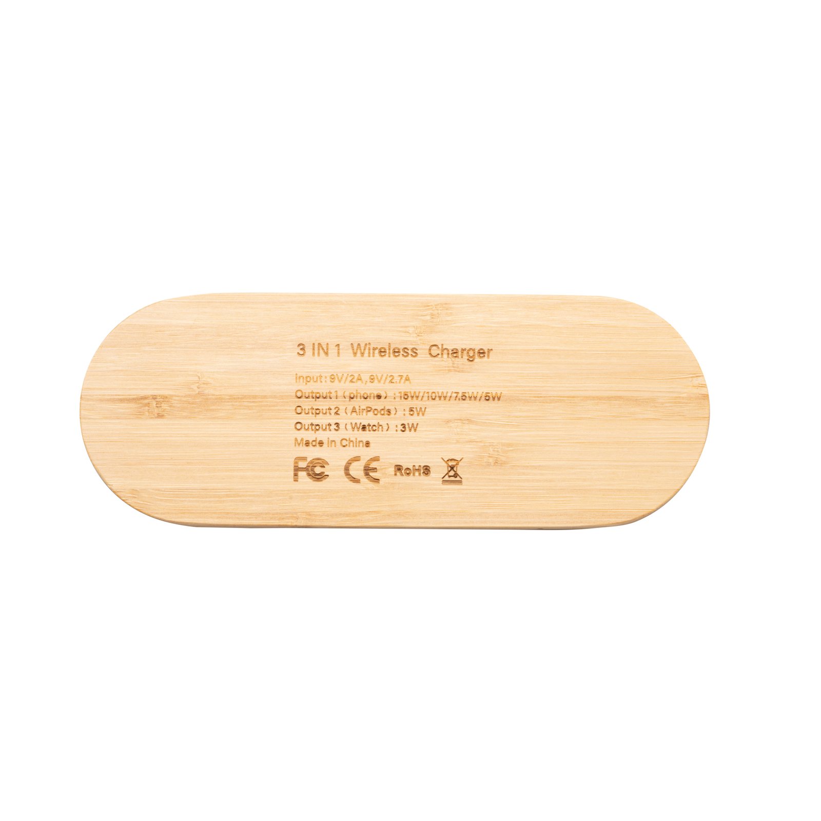 Base de carga 3 en 1, realizada en bambú. Ofrece hasta 15W de potencia para la carga de smartphones, smartwatches y auriculares inalámbricos simultáneamente. Con indicadores luminosos de carga de cada una de las bases. Con puerto de entrada Tipo C de conexión a corriente.