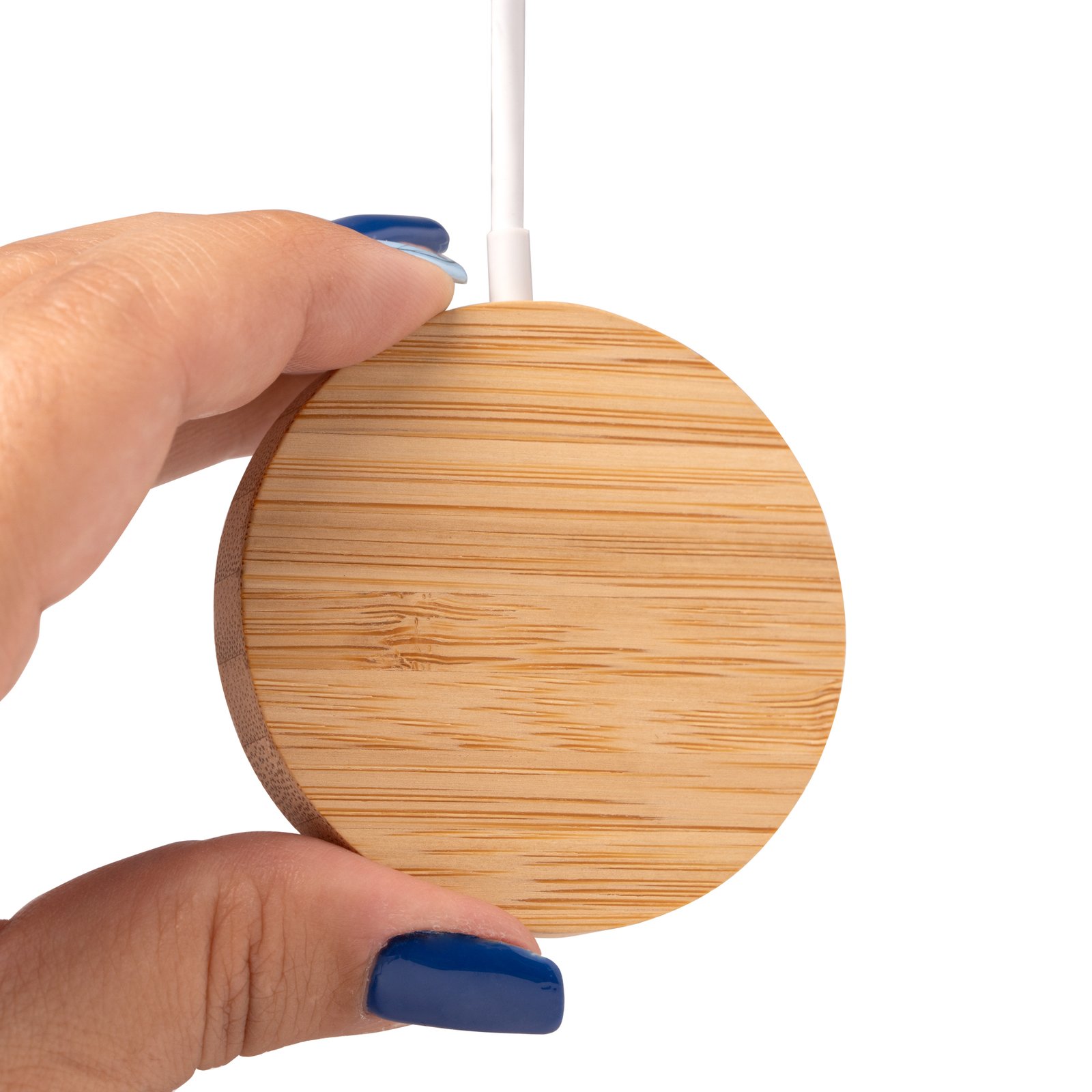 Cargador inalámbrico elaborado en bambú. Con función magnética en superficie mediante anillo magnético. Potencia de carga de 15W. Compatible con dispositivos provistos de tecnología de carga inalámbrica. Incluye anillo accesorio adhesivo.