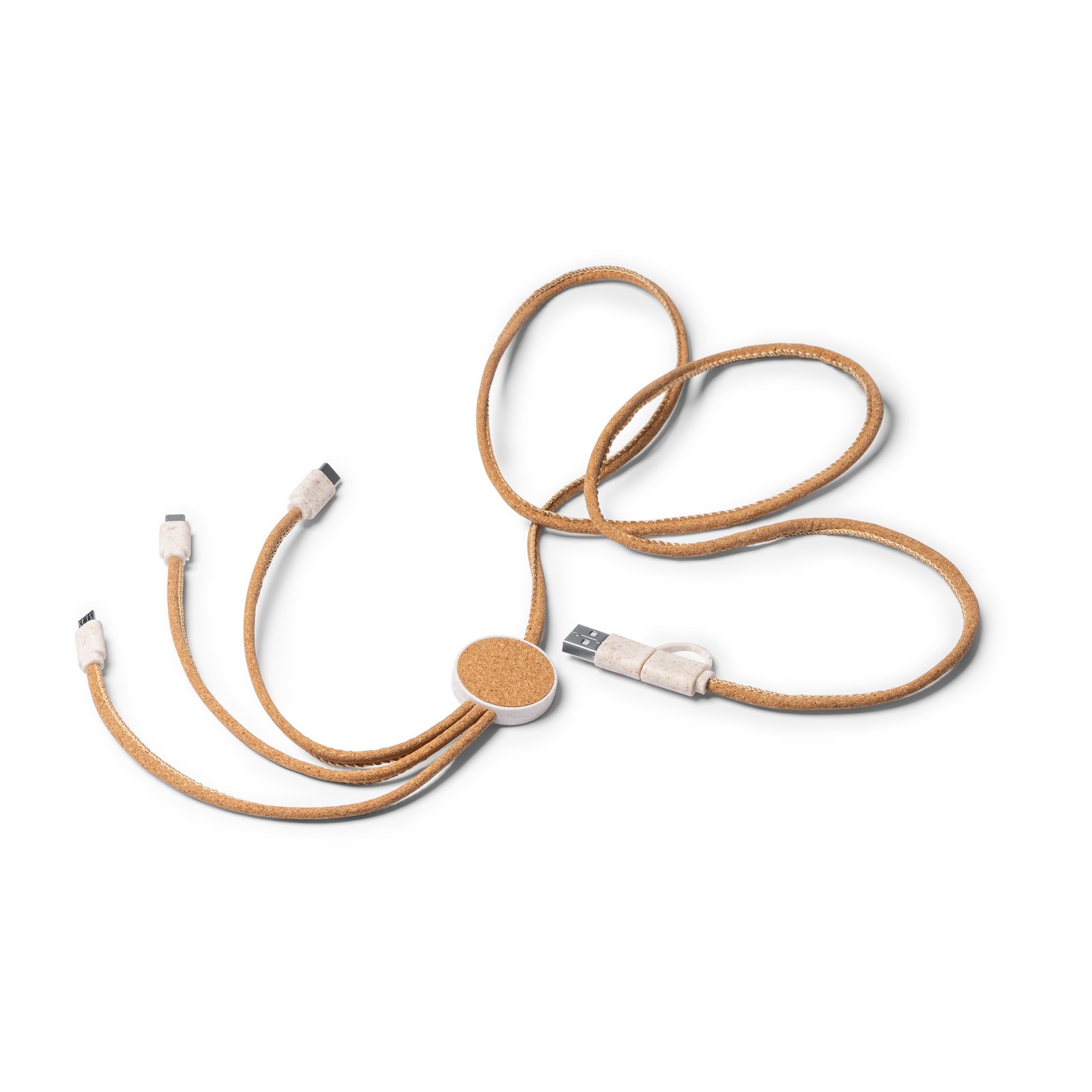 Cable cargador 5 en 1 con cuerpo de corcho y fibra de trigo. Con cable de 125 cm de longitud. Cuenta con entrada Tipo C con adaptador USB. Salidas Micro USB, Tipo C y Lightning para mayor compatibilidad con dispositivos electrónicos.
