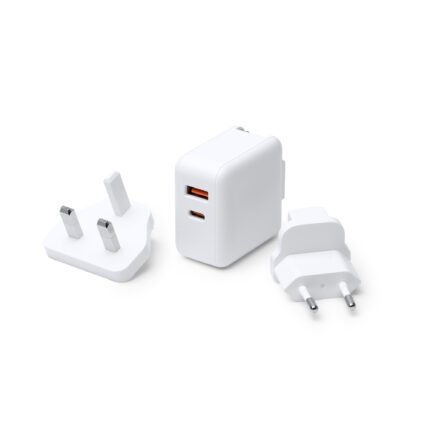 Adaptador de enchufes para viajes. Elaborado en policarbonato de alta calidad con una potencia de 20W y carga rápida. Cuenta