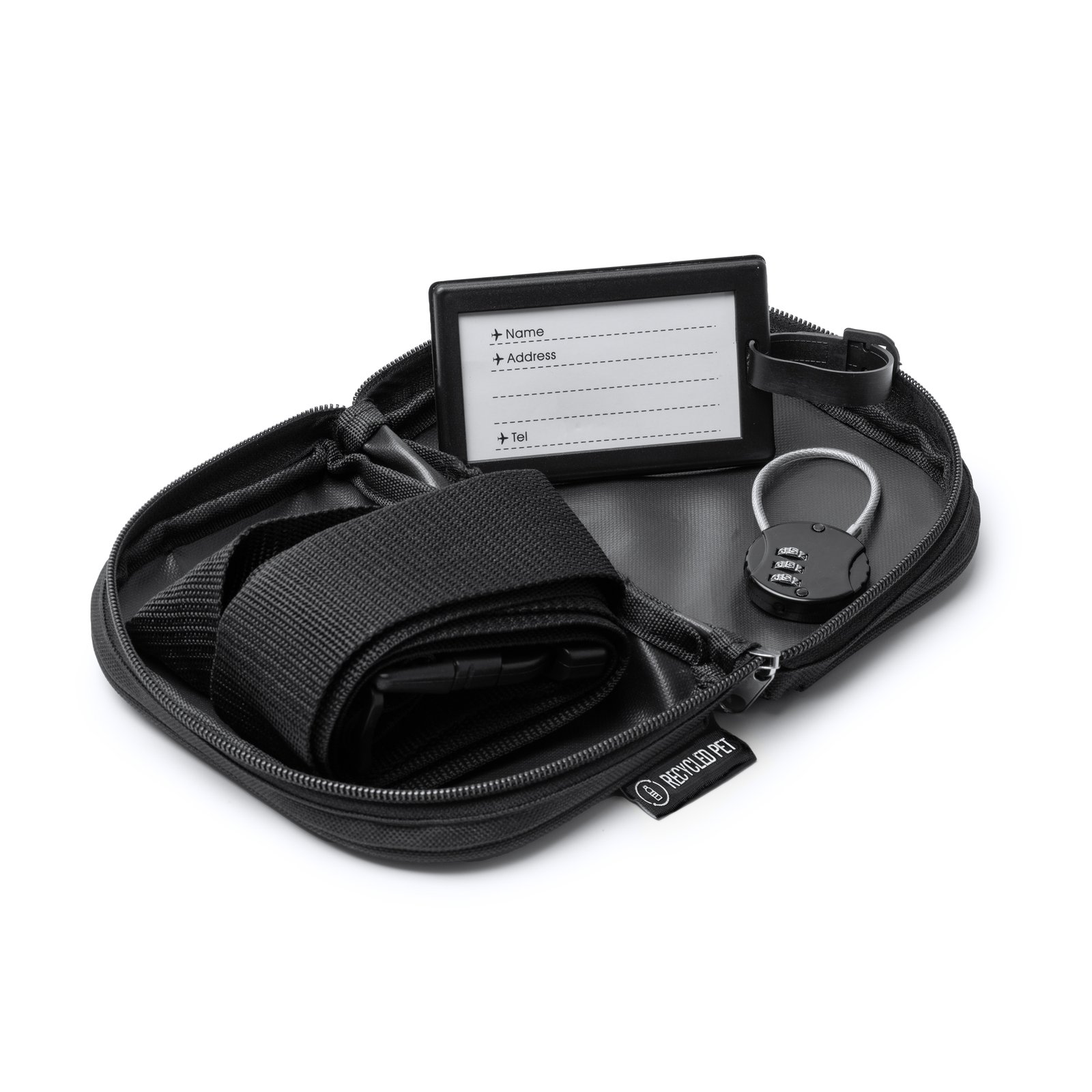 Set de viaje 3 en 1. Incluye candado con contraseña numérica de tres dígitos, tarjeta identificadora elaborada en PP y una cinta ajustable para maleta para dotarla de mayor seguridad. Todos estos accesorios se presentan en una funda elaborada en RPET con cierre de cremallera con apertura completa del mismo.