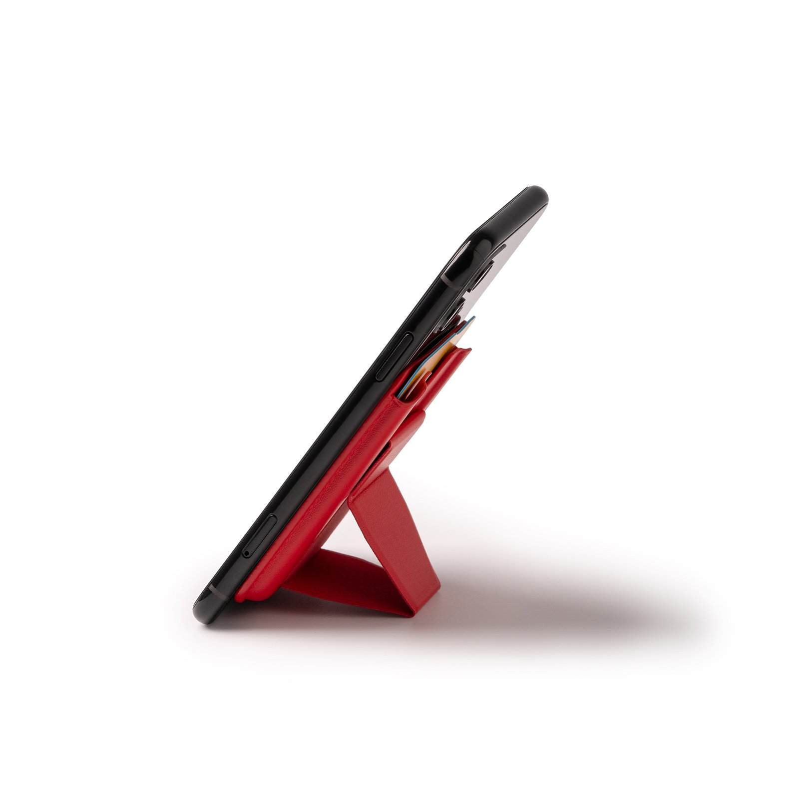 Tarjetero con soporte plegable realizado en PU reciclado. Un accesorio con múltiples opciones, pudiendo posicionar tu smartphone en horizontal y vertical a la par que llevas tus tarjetas contigo.