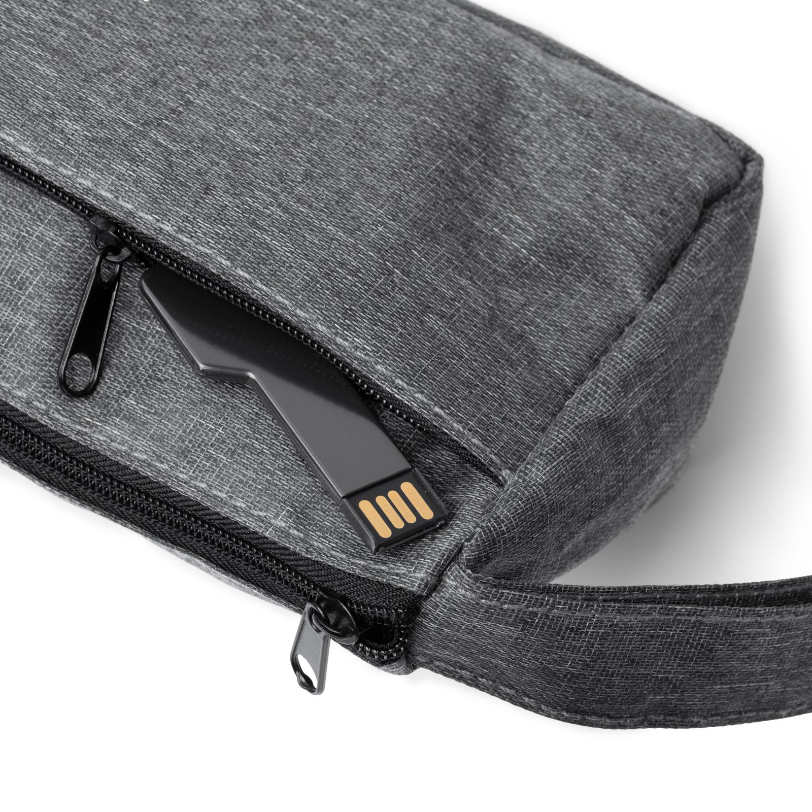 Estuche triangular realizado en 300D RPET con diseño vigoré. Cuenta con un compartimento principal con cierre de cremallera y un bolsillo exterior para almacenamiento de menor tamaño. Incorpora una práctica asa de transporte a juego.