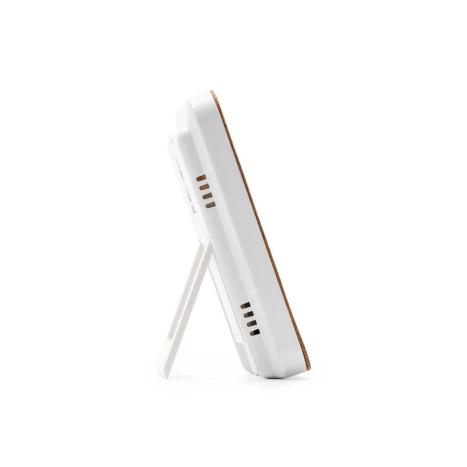 Estación meteorológica con carcasa frontal de bambú. Función reloj con sensores de temperatura y humedad. Panel de control táctil. Registro de temperatura y humedad máxima y mínima.