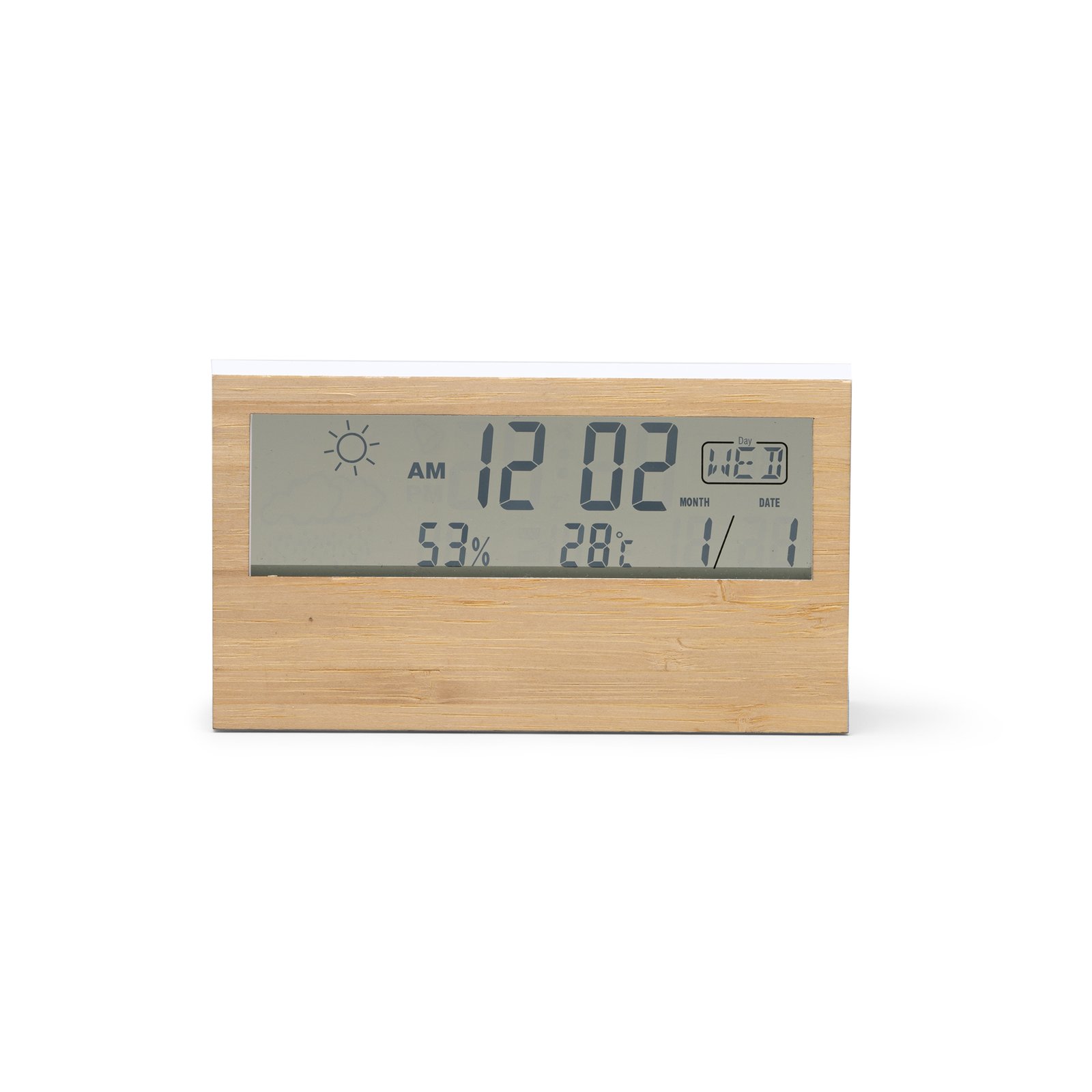 Estación meteorológica con carcasa frontal de bambú. Con pantalla LCD, y botones de ajuste en la parte trasera. Cuenta con funciones adicionales de reloj, calendario y alarma. Con detección automática de temperatura y humedad.