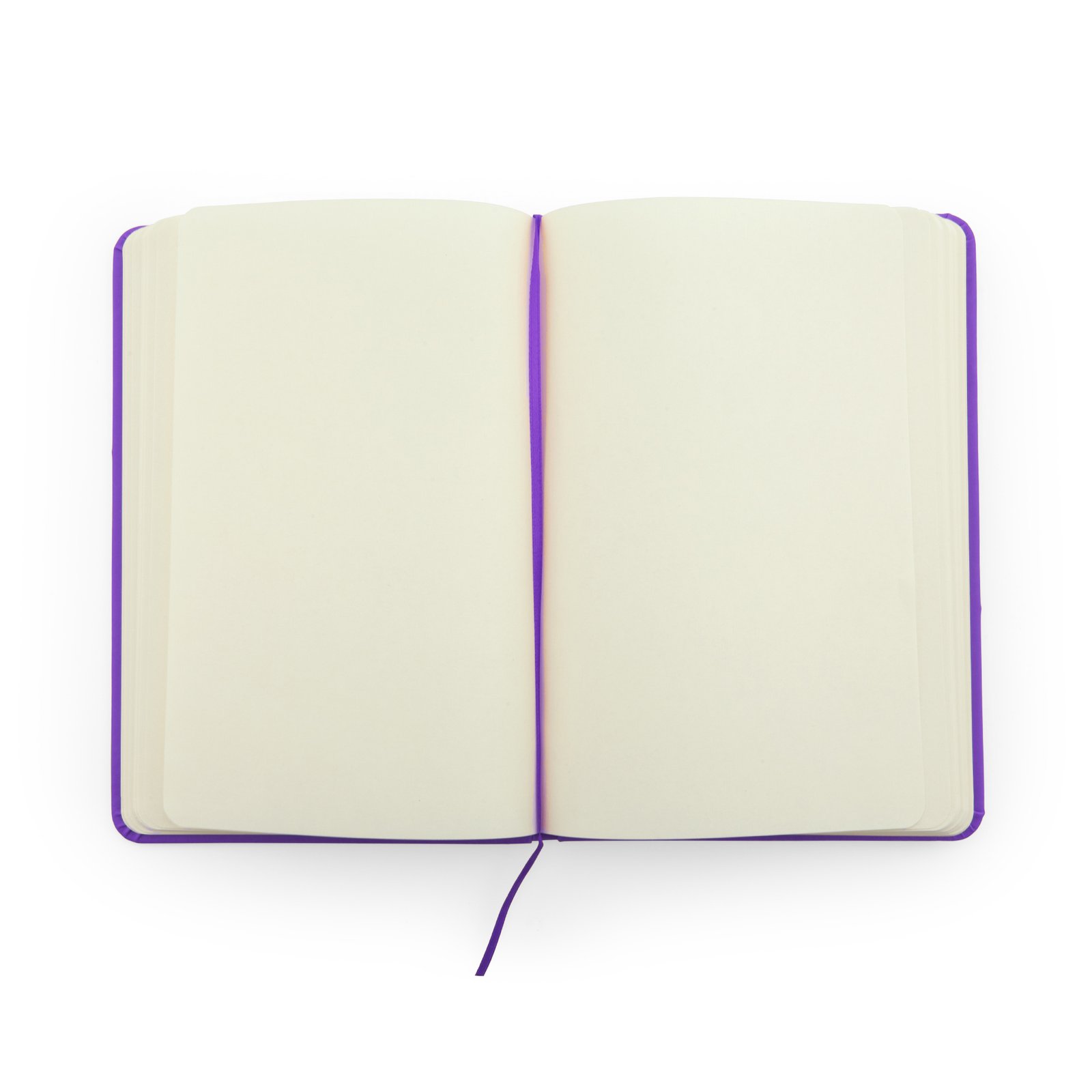 Bloc de notas A5 con tapa rígida de polipiel. Marcapáginas y banda elástica. 100 hojas lisas.